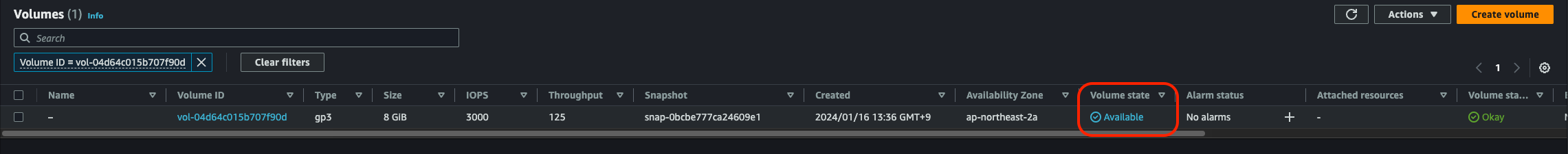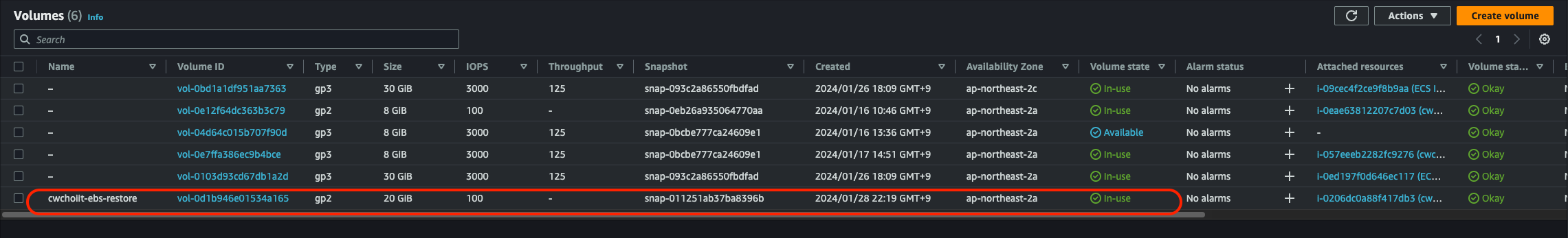 Volume 리스트에 스냅샷으로부터 복원된 EBS가 보인다.