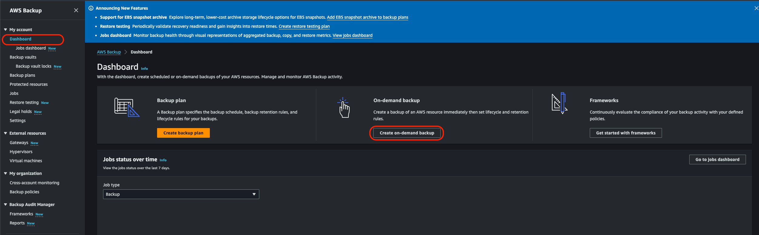 이번에는 RDS를 백업해보자. AWS Backup 서비스로 가서 Dashboard 화면에서 "Create on-demand backup" 버튼 클릭