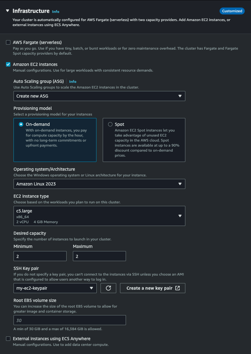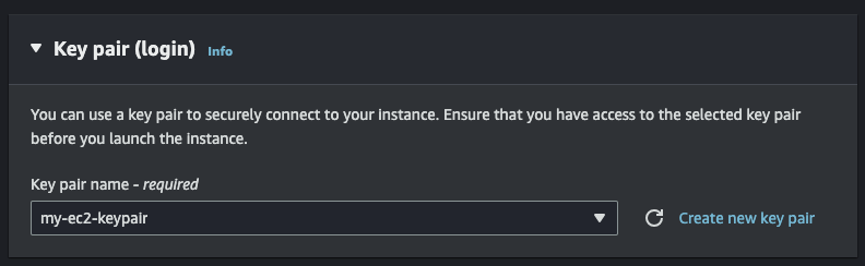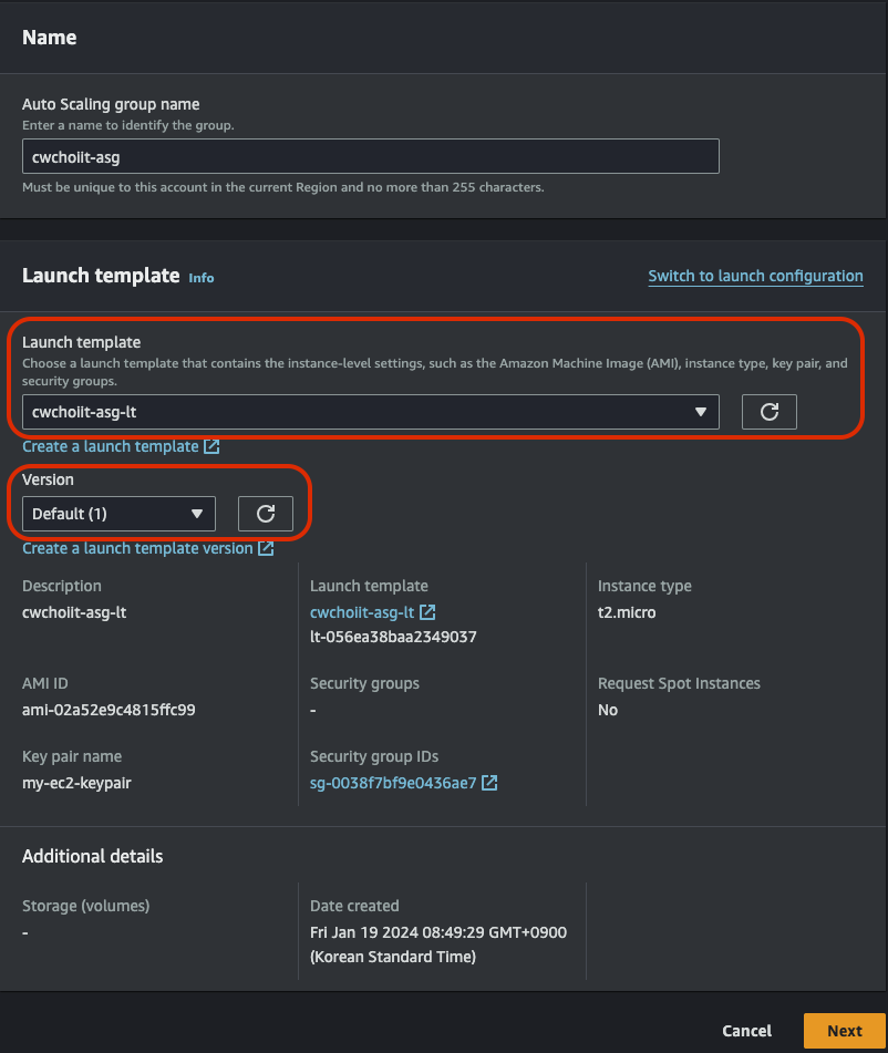 Name을 적절히 설정해주고 OS Image는 Amazon Linux, 그 외 다 기본값으로 설정하고 Key pair는 위에서 만든 EC2에 사용한 것을 그대로 사용한다.