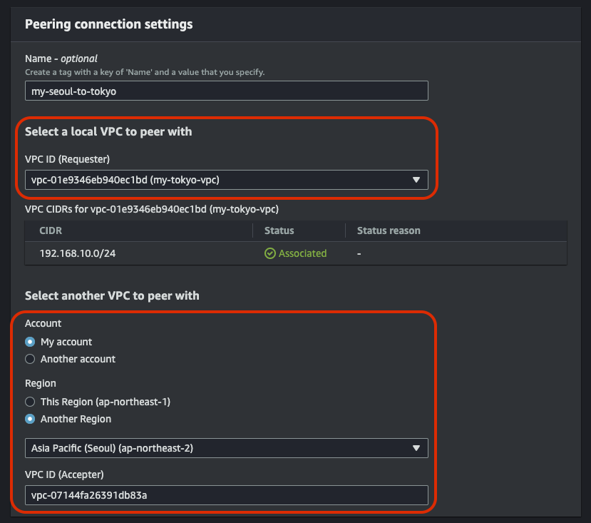 Peering connection settings에서 로컬 VPC는 도쿄니까 도쿄의 VPC를 선택하고 연결할 VPC는 일단 내 계정의 다른 지역을 선택해서 서울을 선택하고 서울의 내가 가지고 있는 특정 VPC ID를 입력해주면 된다. 그리고 생성하자.