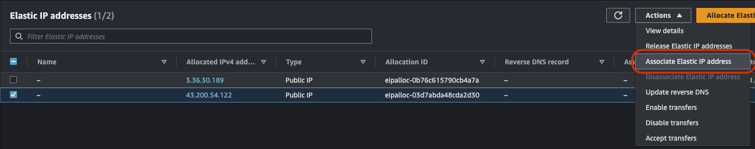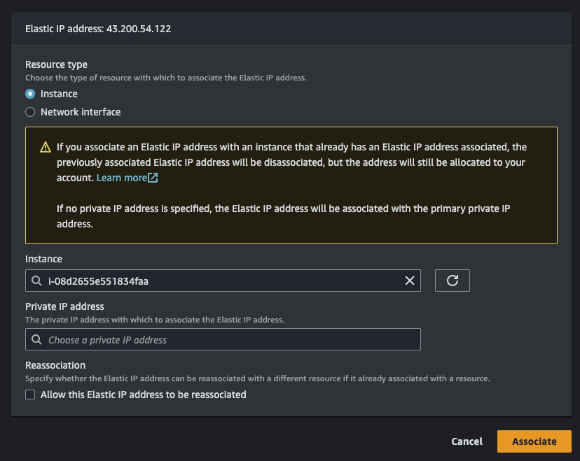 모든 값은 기본값으로 두고 하단 'Allocate' 버튼을 누르면 방금 생성한 Elastic IP가 나오고 그 녀석을 선택해서 방금 만든 EC2에 할당한다.