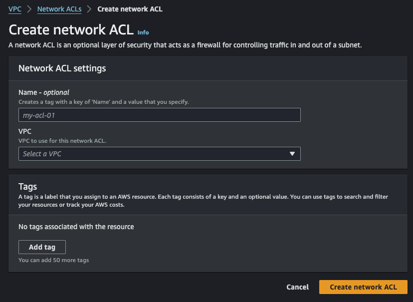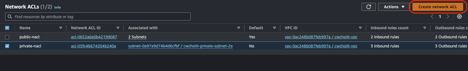 이렇게 보다시피 화면 우측 상단 Create network ACL 버튼이 보인다. 클릭.