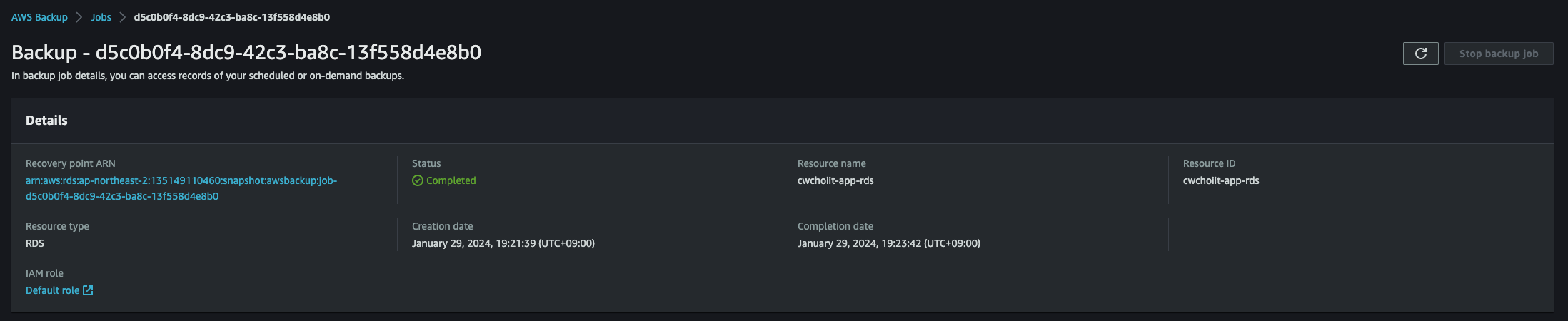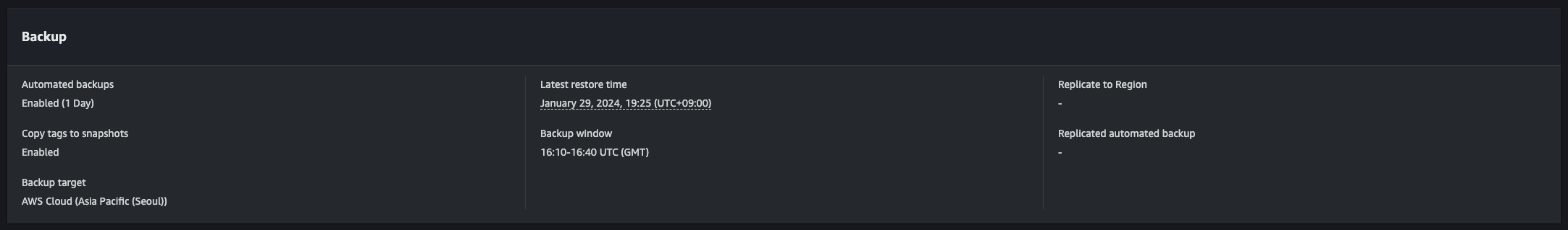 여기서 한 가지 알고 가야하는건 RDS 서비스를 만들면 시스템에서 자동으로 백업을 하는데 그 백업 시간이 있다. 이 백업 시간과 내가 직접 백업을 하려는 백업 시간이 너무 가까우면 위 작업을 따라했을 때 백업이 되지 않는다. 이를 참고하자. RDS의 백업 시간은 아래 사진처럼 확인 가능하다.