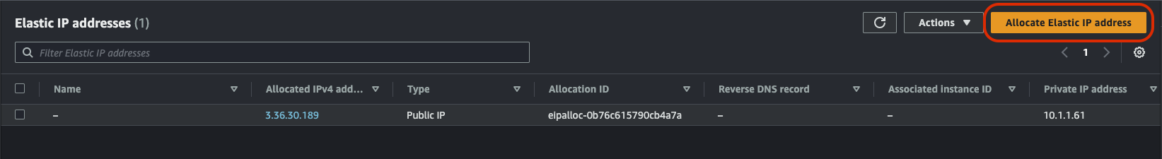 이제 Elastic IP를 방금 생성한 EC2에 할당한다. Network & Security > Elastic IPs로 가서 우측 상단 Allocate Elastic IP address를 클릭한다.