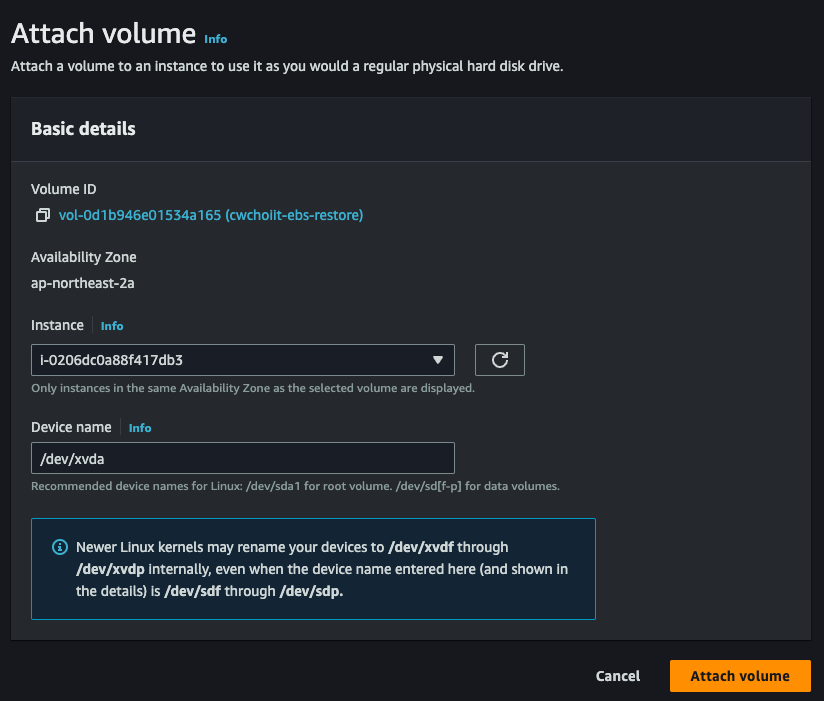 - Device name: /dev/xvda