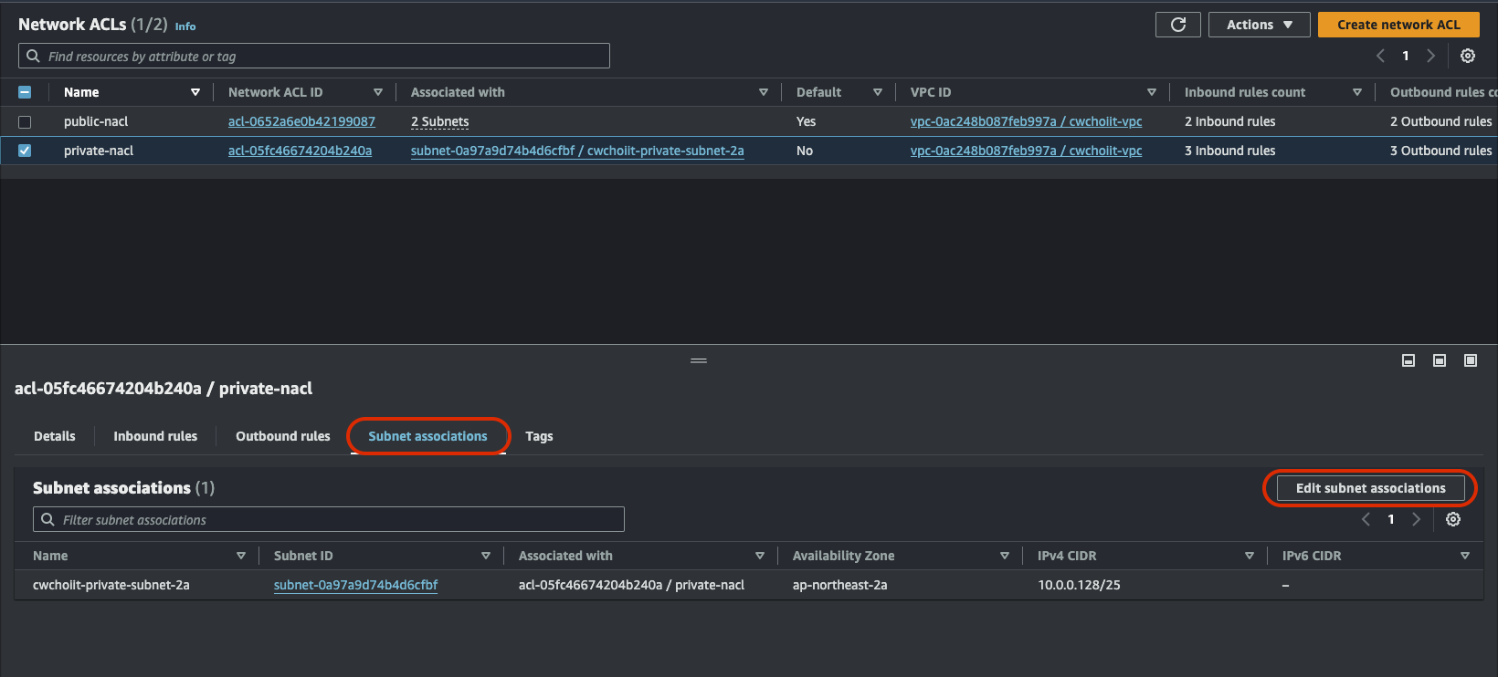 만들고 나면 리스트에 만든 NACL이 보이는데, 클릭해서 우선 서브넷을 연동하자.