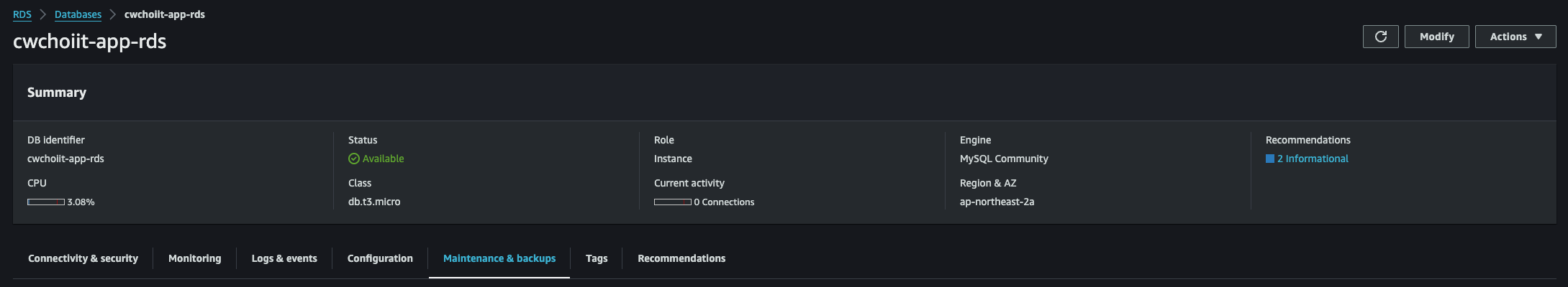백업 시간을 확인하고자 하는 RDS를 클릭 > Maintenance & backups 탭 클릭후 Backup 섹션을 보자.