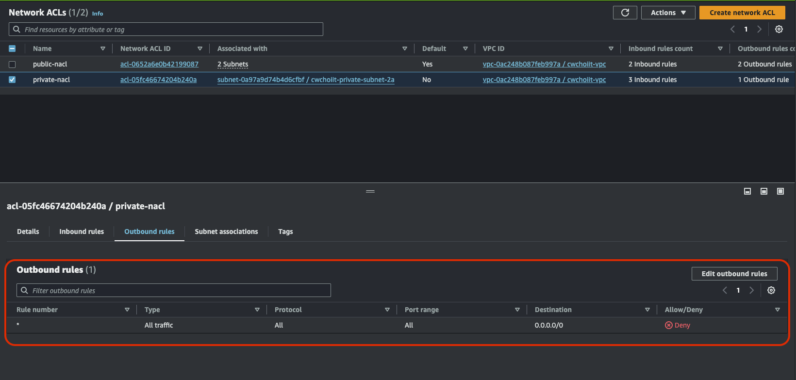 NACL은 Stateless 보안 체계라고 했다. 그래서 규칙이 절대적인데 그 말은 이 상태에서 Outbound 규칙을 제거하면 접속이 불가능해야 한다. 한번 해보자. 보다시피 Outbound 규칙이 전부 Deny 상태이다.