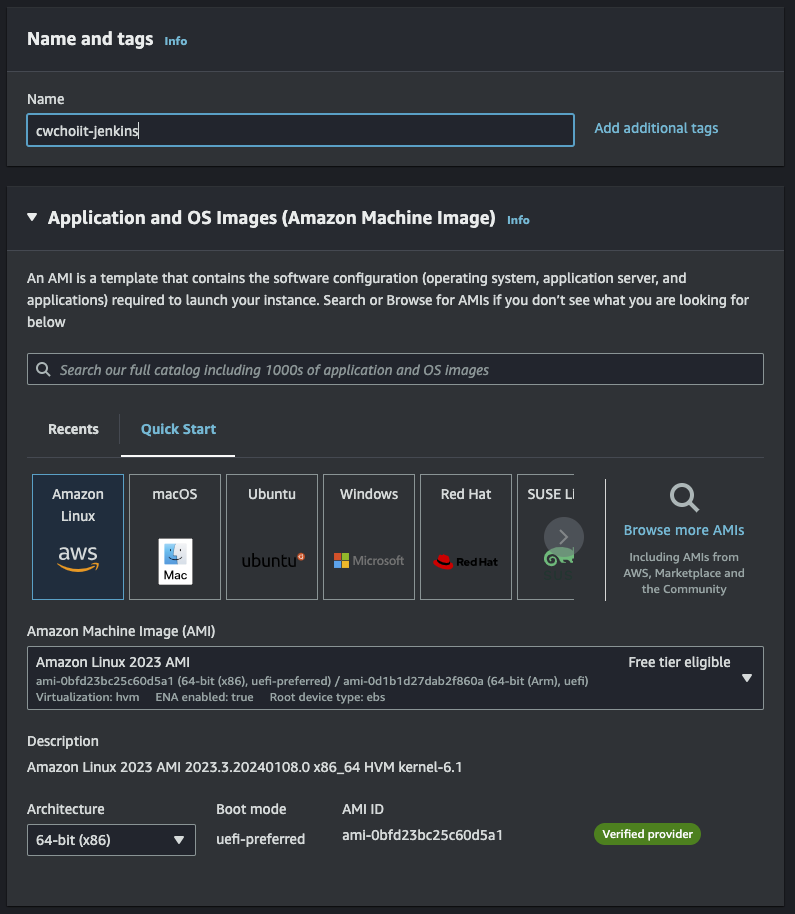 이제 인스턴스를 생성해 보자. 생성 화면에서 인스턴스의 Name을 설정한다. 그리고 OS Image는 Amazon Linux를 사용한다.