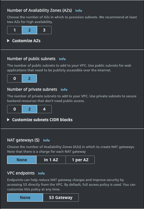 그 다음 AZ는 2개, Public subnets 2개, Private subnets 2개, NAT gateway는 생성하지 않고, VPC endpoint도 생성하지 않는다.