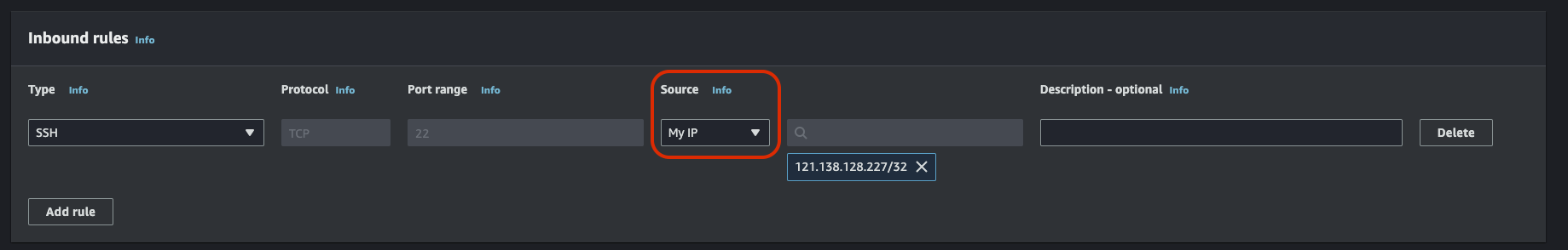 하단 인바운드 규칙에서는 AWS DevOps 유저가 오로지 현재 본인 만이라고 가정하고 SSH 접속 허용 IP를 My IP로 할당하자.