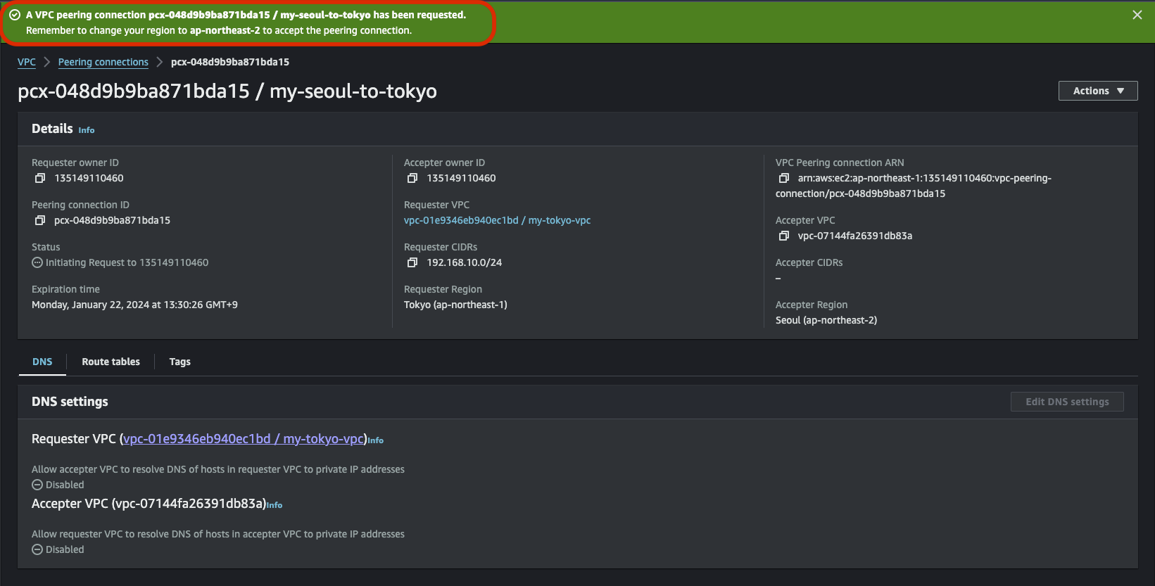 서울과 도쿄에 있는 VPC간 Peering을 해서 서로 통신이 가능하게 해보자.