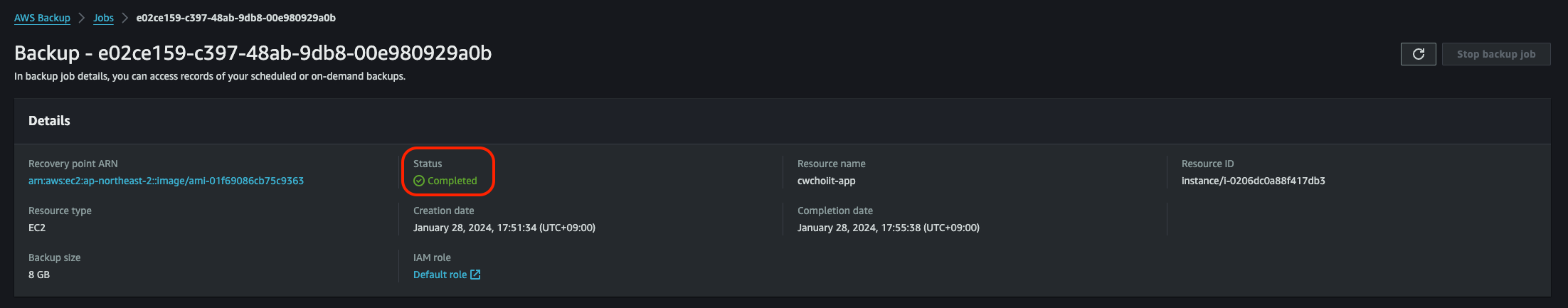 RDS 백업은 시간이 조금 소요되므로 여유롭게 기다려보자. 시간을 좀 기다리고 나니 다음과 같이 백업이 완료됐다. Status가 Completed 상태가 된 것을 확인할 수 있다.