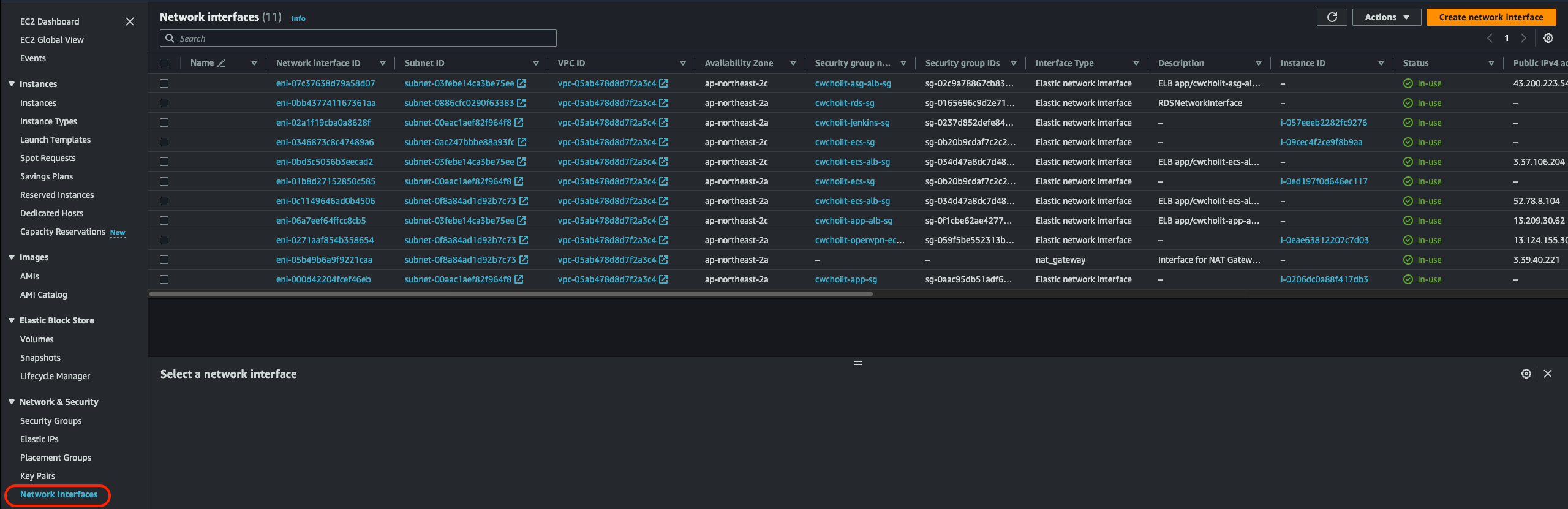 아직 로그가 생성되지 않았고 이 로그를 생성하기 위해 트래픽을 발생시켜보자. 이 VPC 플로우 로그는 EC2에 붙어있는 네트워크 인터페이스에서 발생하는 모든 트래픽을 트래킹한다. 아래 사진이 EC2의 네트워크 인터페이스에 들어가면 보여지는 모든 네트워크 인터페이스이다. 모두 동일한 VPC(위에서 설정한 VPC)에 붙어있는 네트워크 인터페이스이고 이 네트워크를 통한 트래픽에 대한 로그를 남긴다.