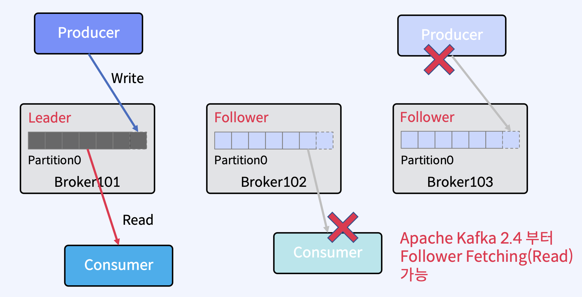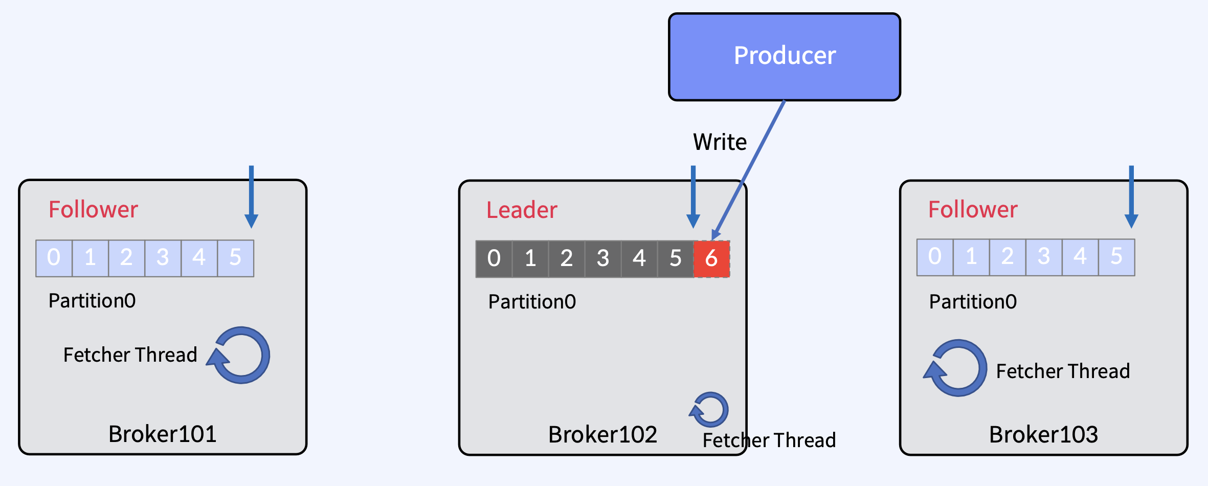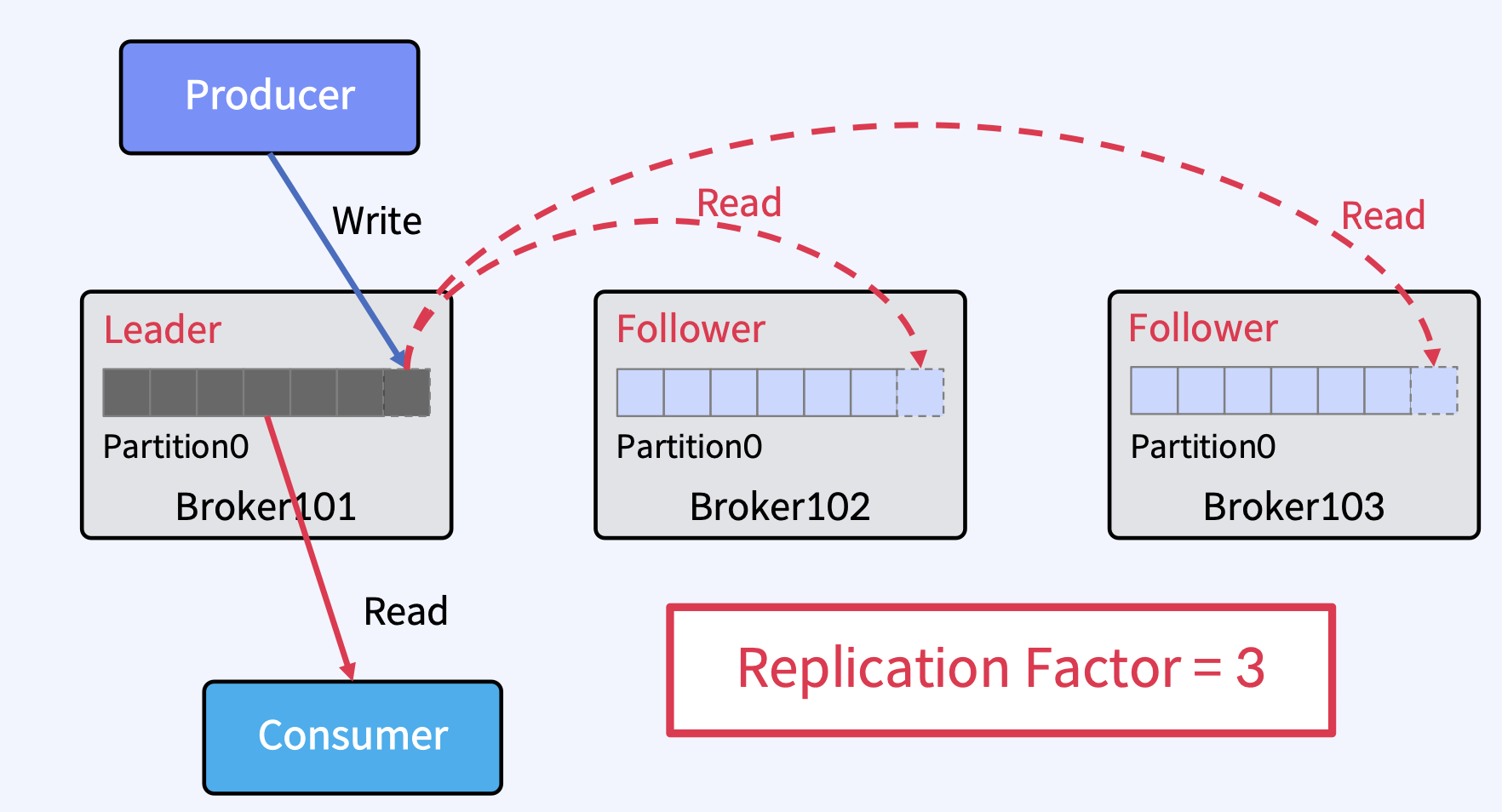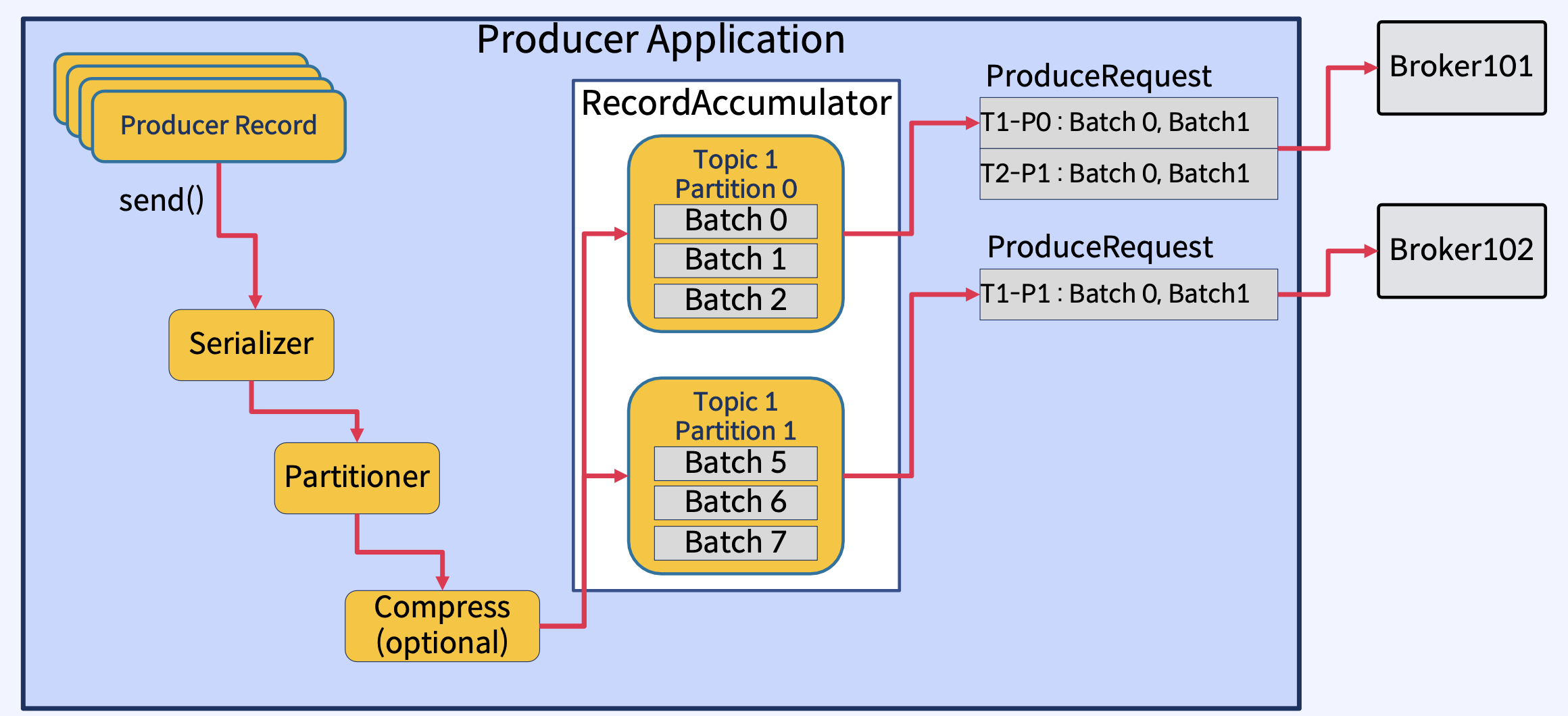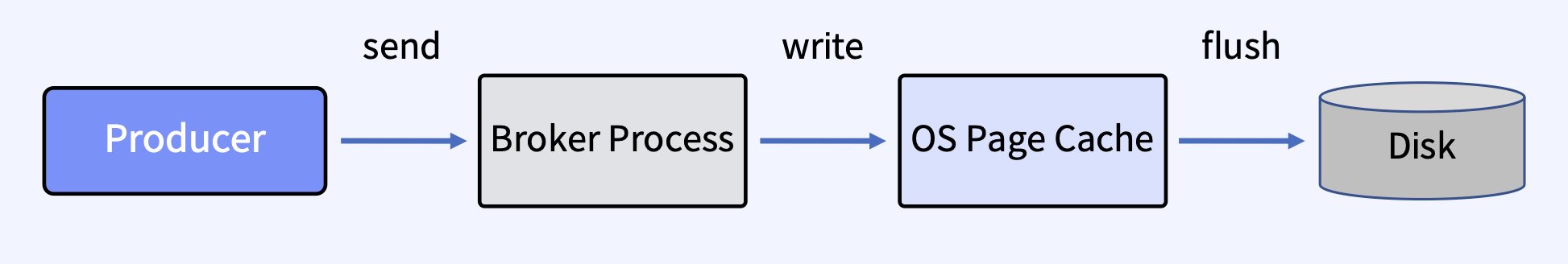 - Producer는 하나 이상의 ProduceRequests(Producer의 send()에서 시작됨)를 통해 User Topic Partitions에 메시지를 Write.