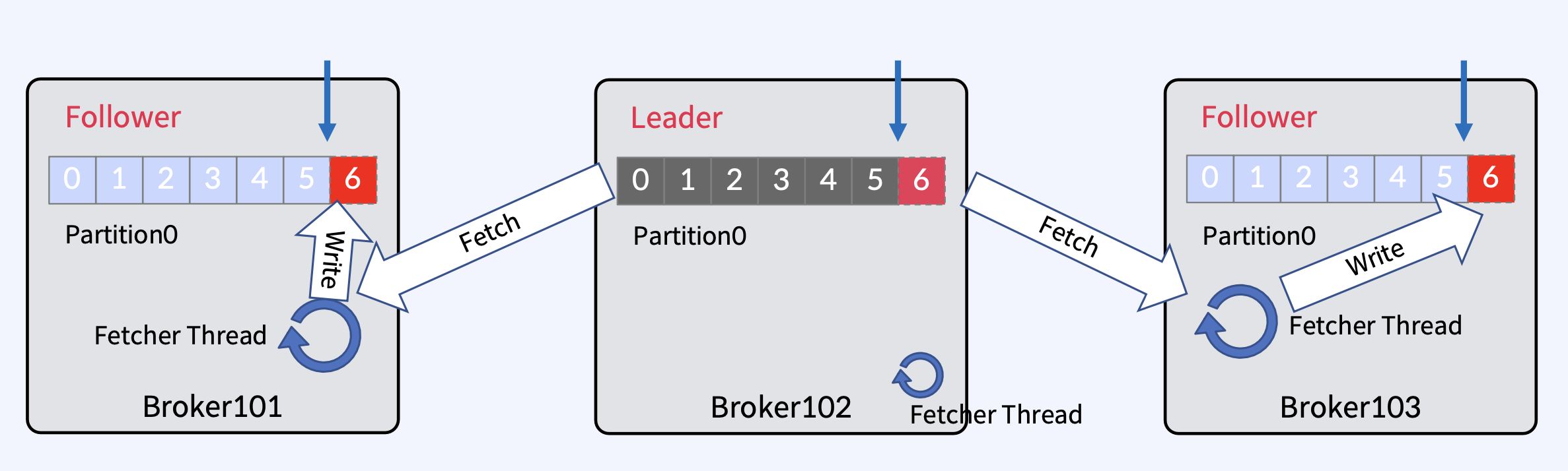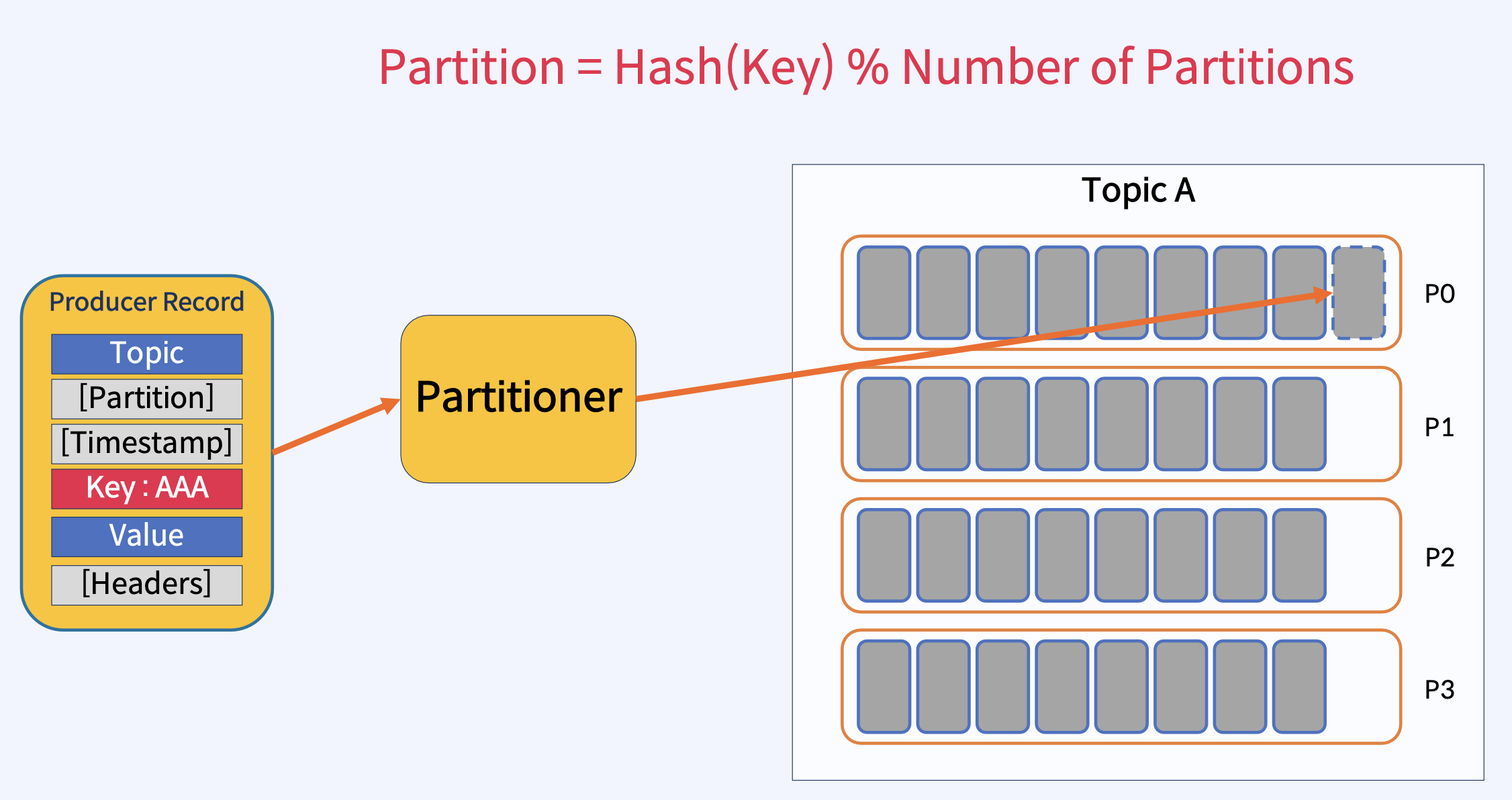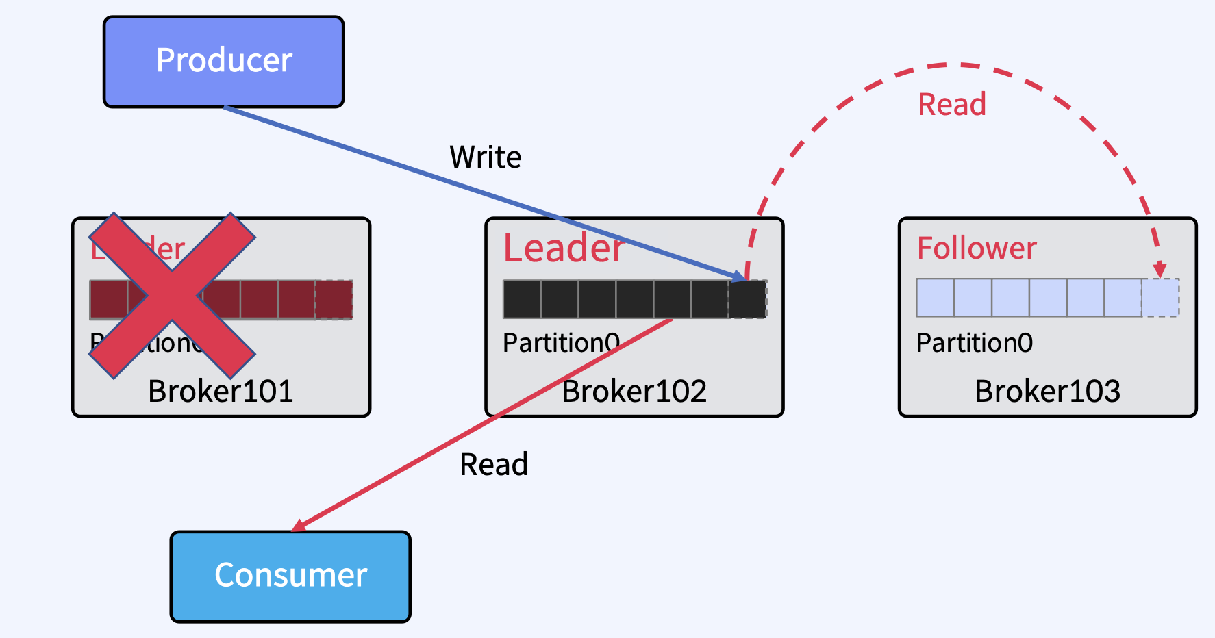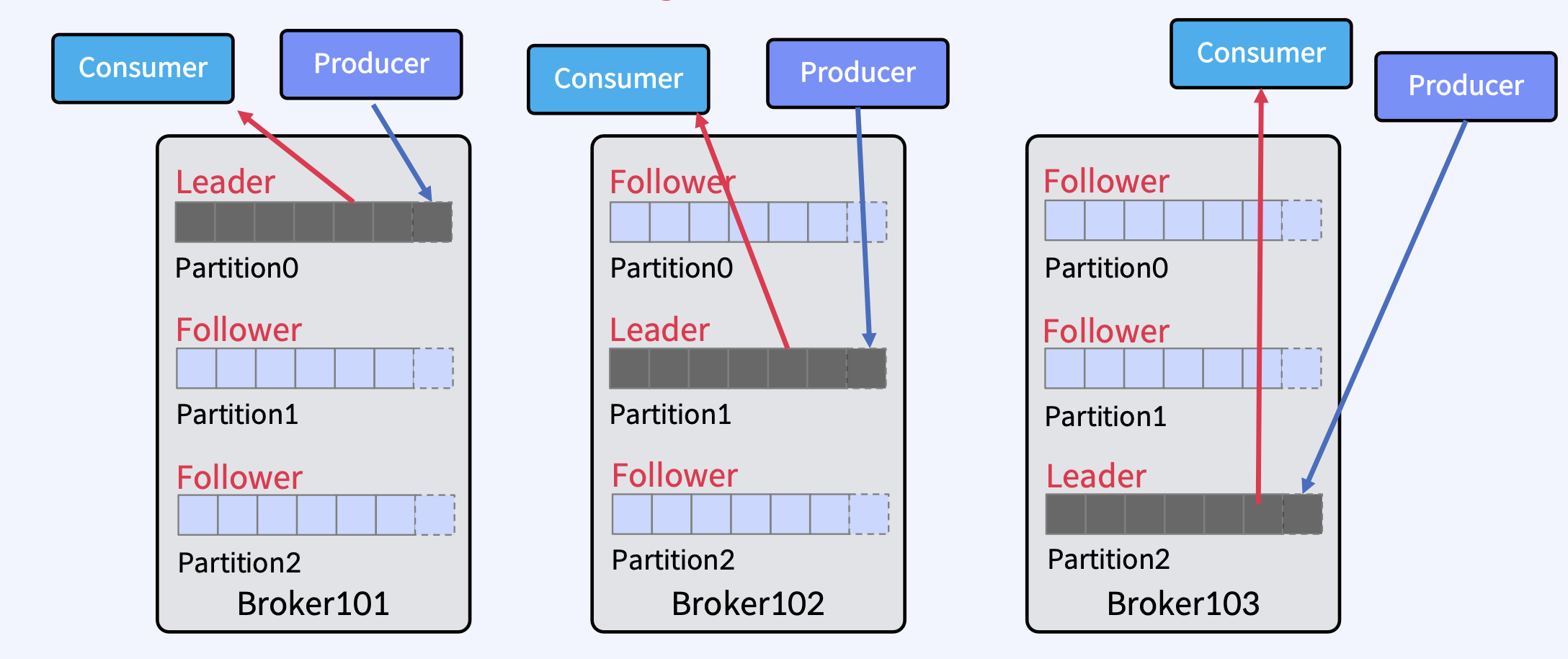 - Producer는 하나 이상의 ProduceRequests(Producer의 send()에서 시작됨)를 통해 User Topic Partitions에 메시지를 Write.