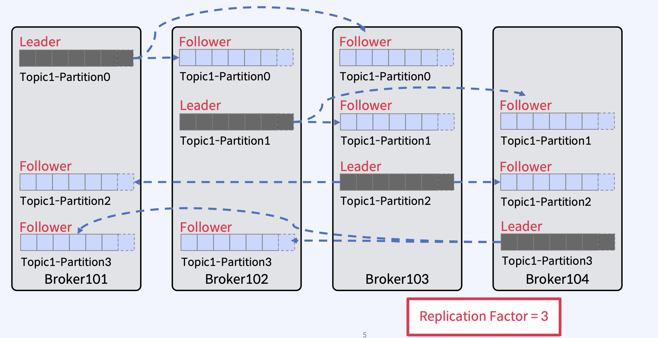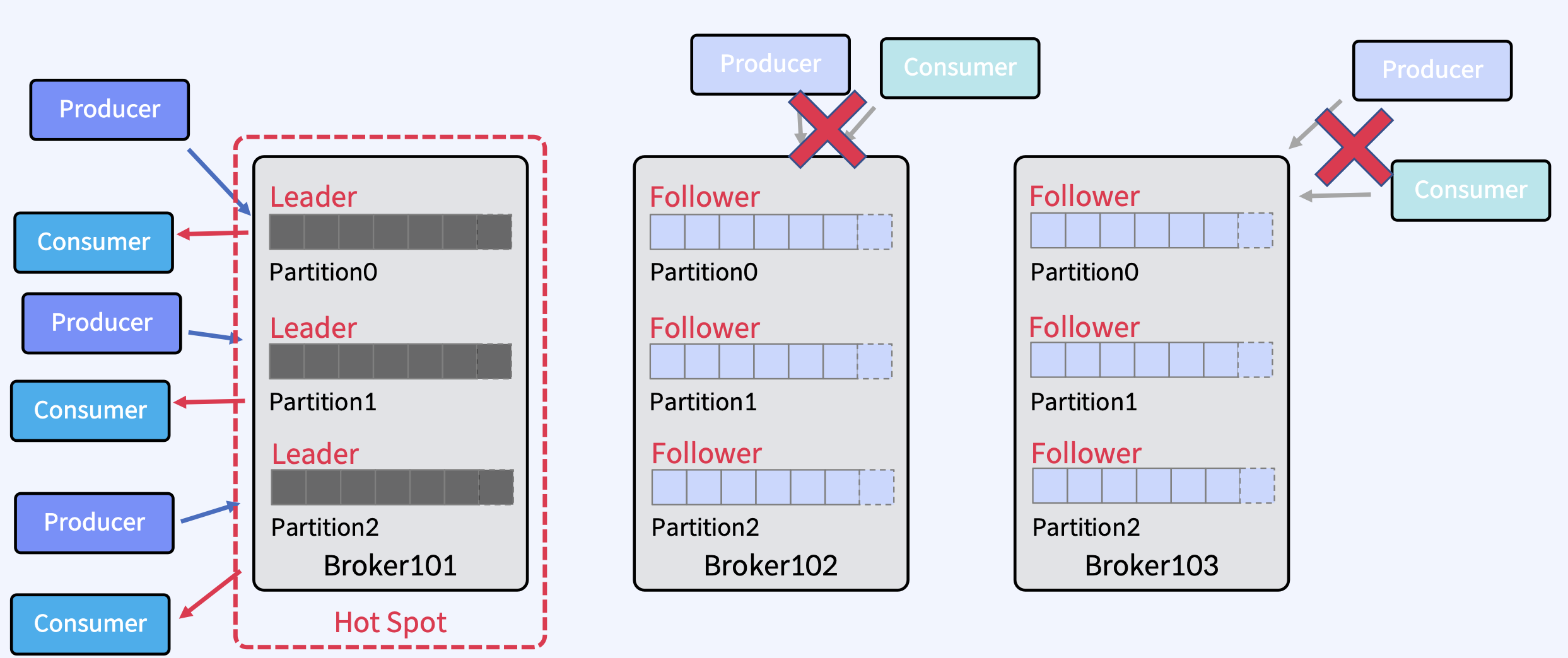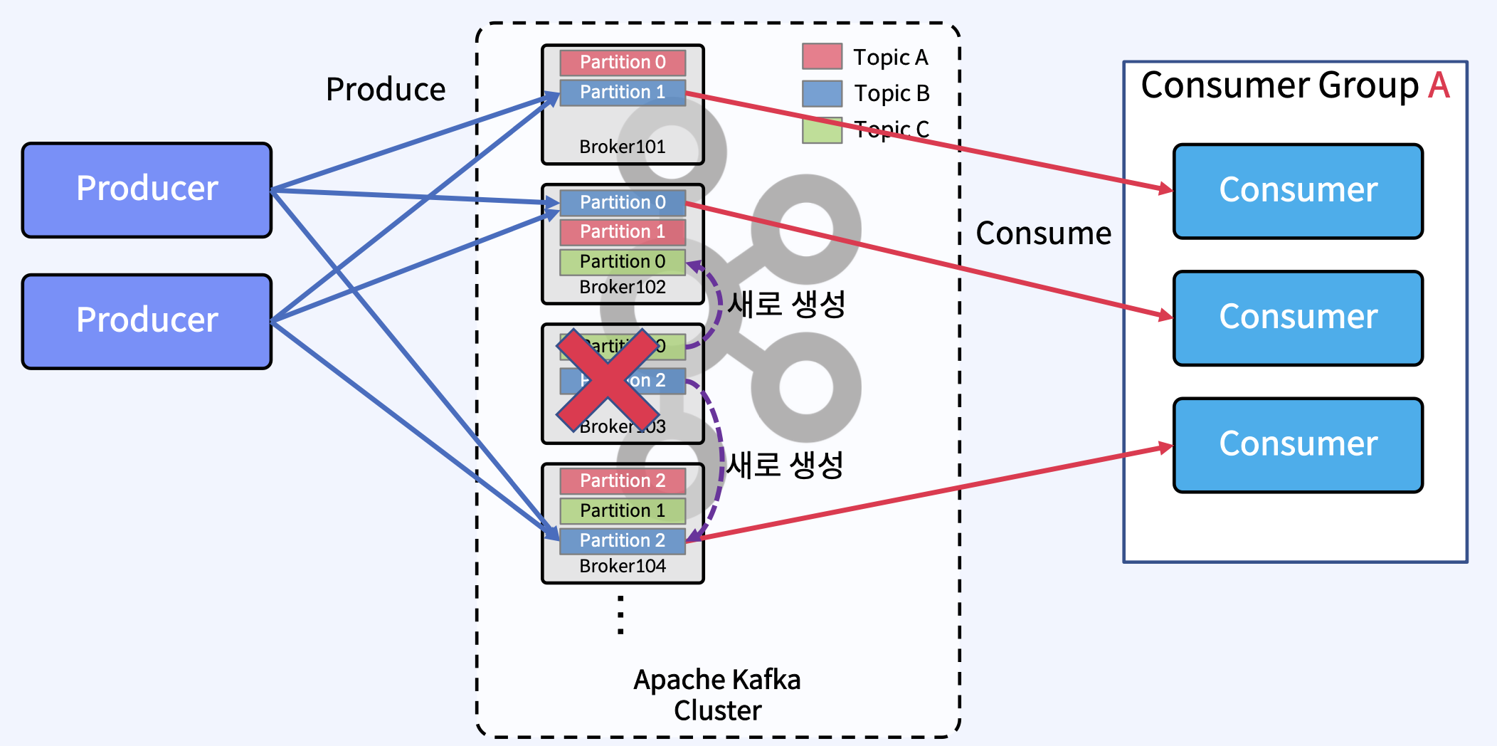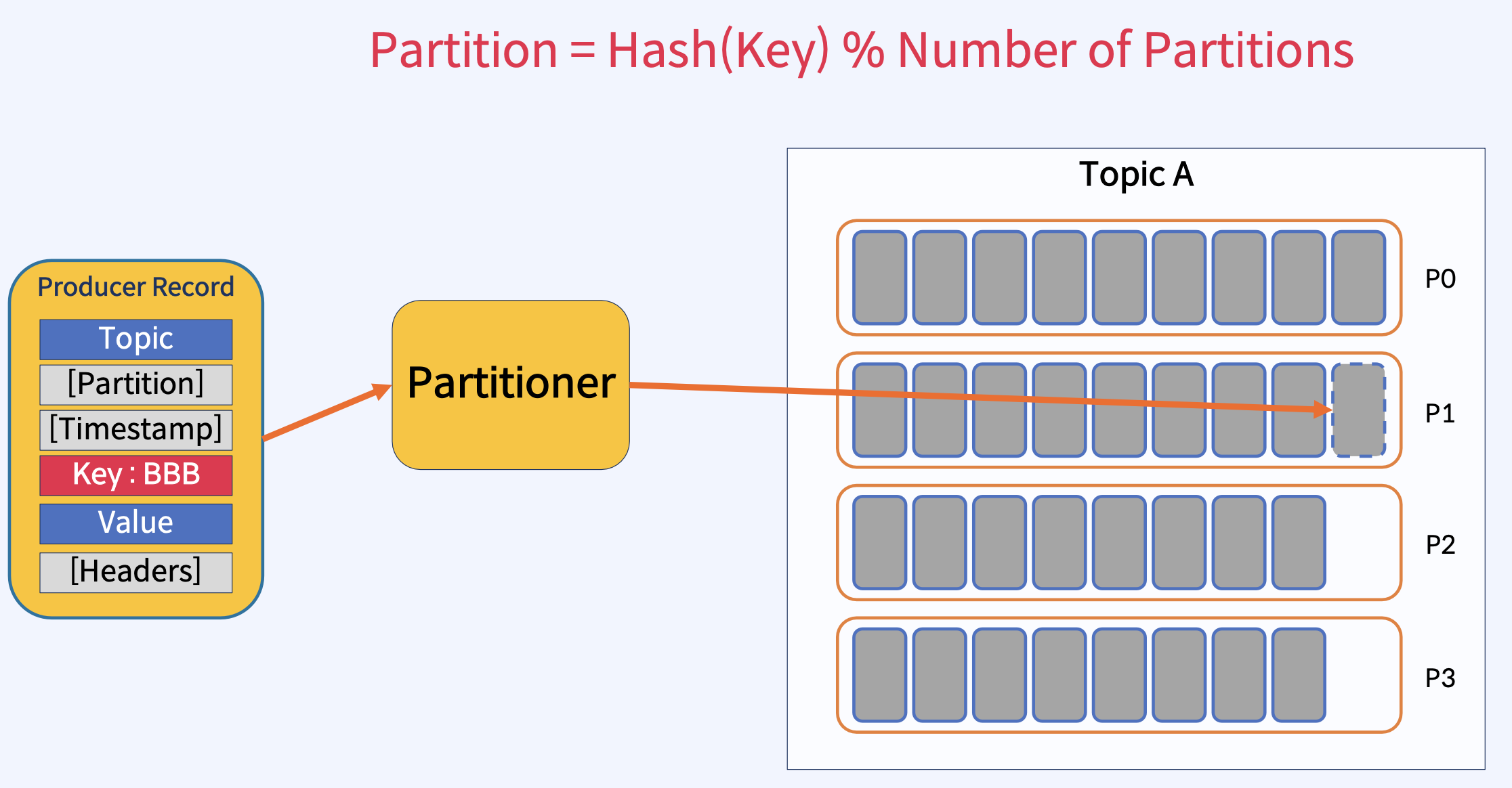 - Producer는 하나 이상의 ProduceRequests(Producer의 send()에서 시작됨)를 통해 User Topic Partitions에 메시지를 Write.