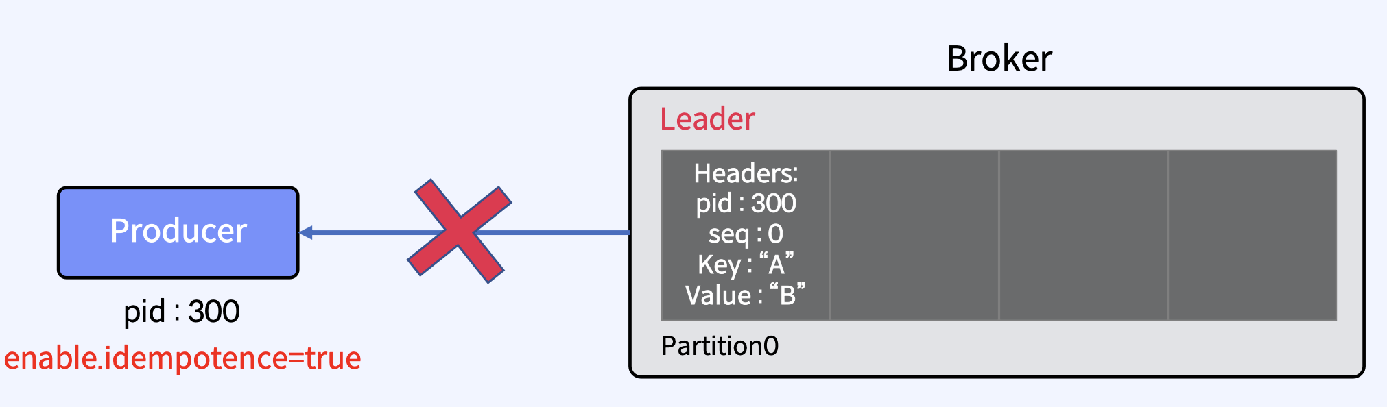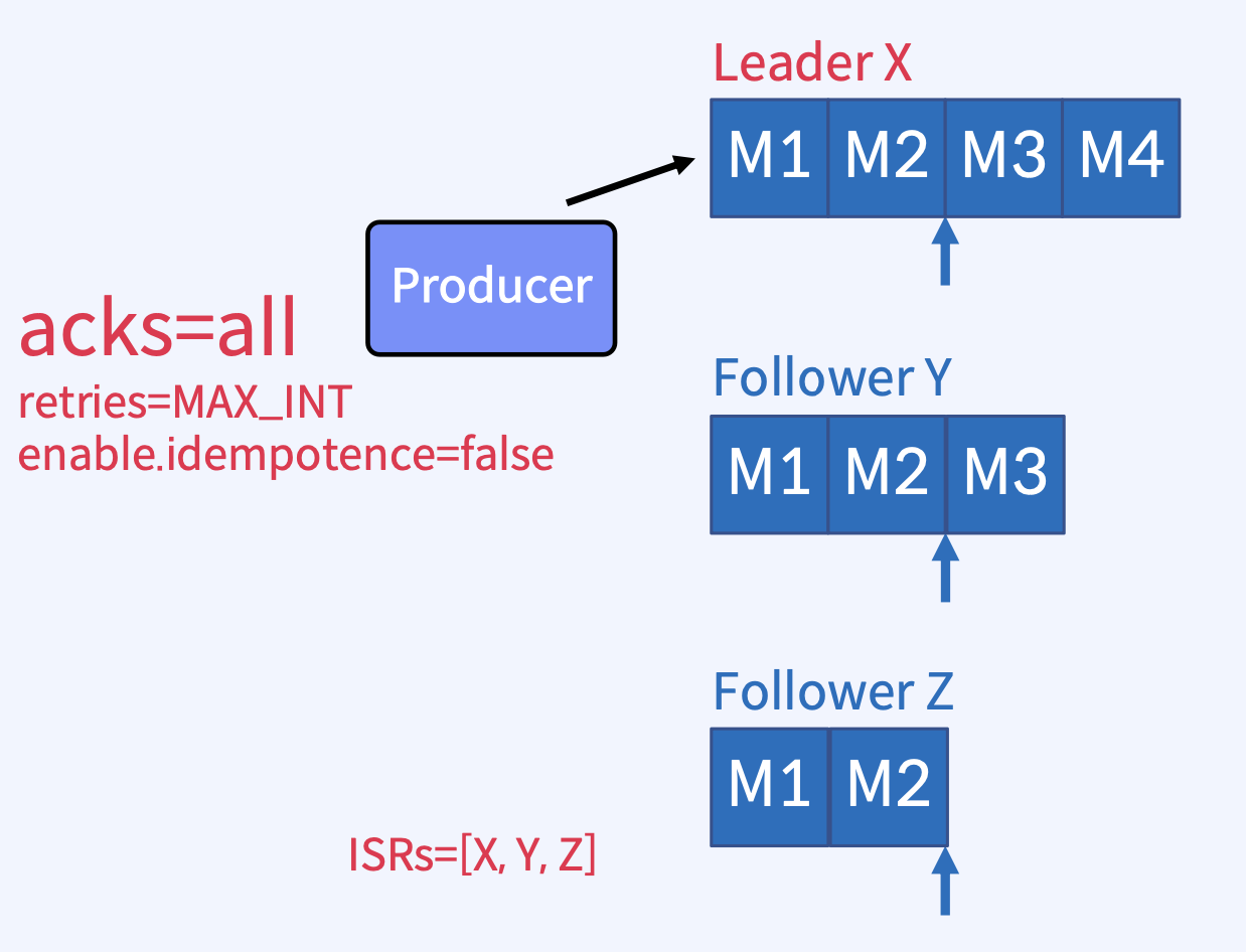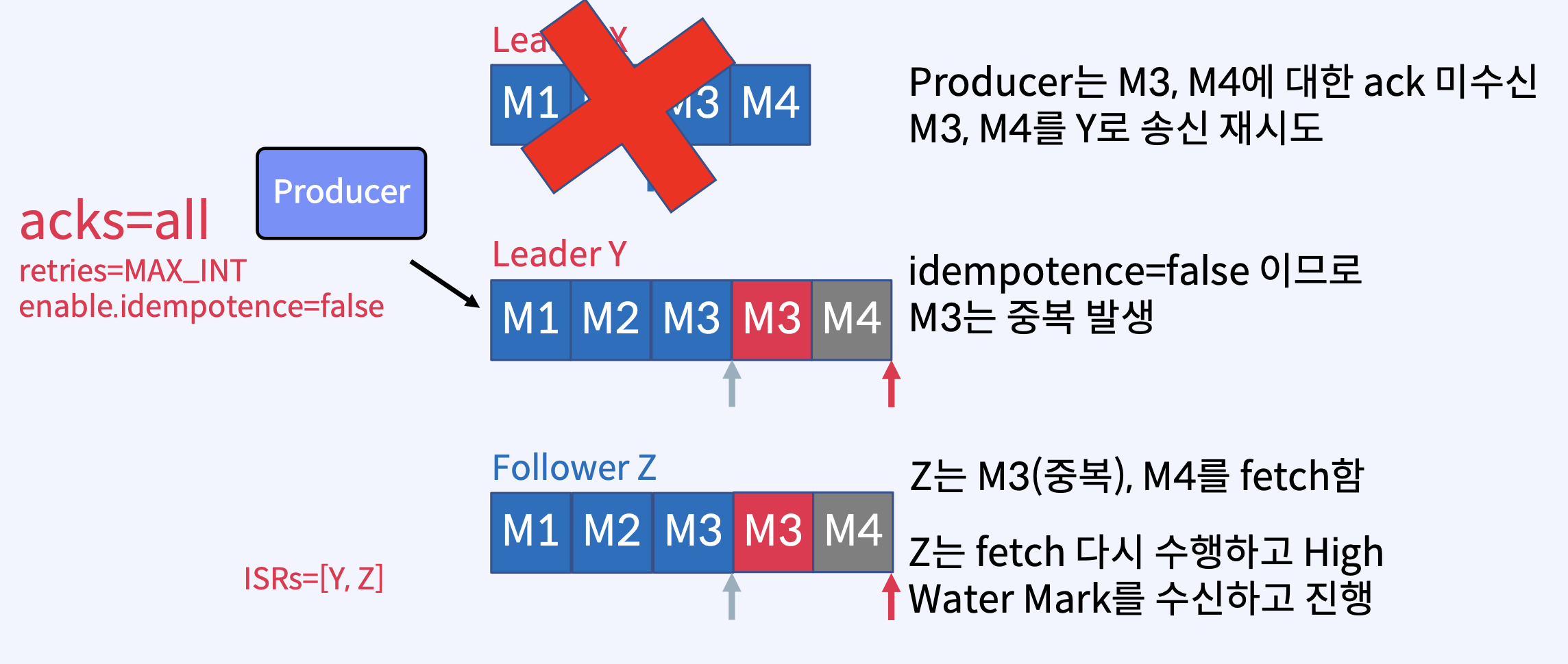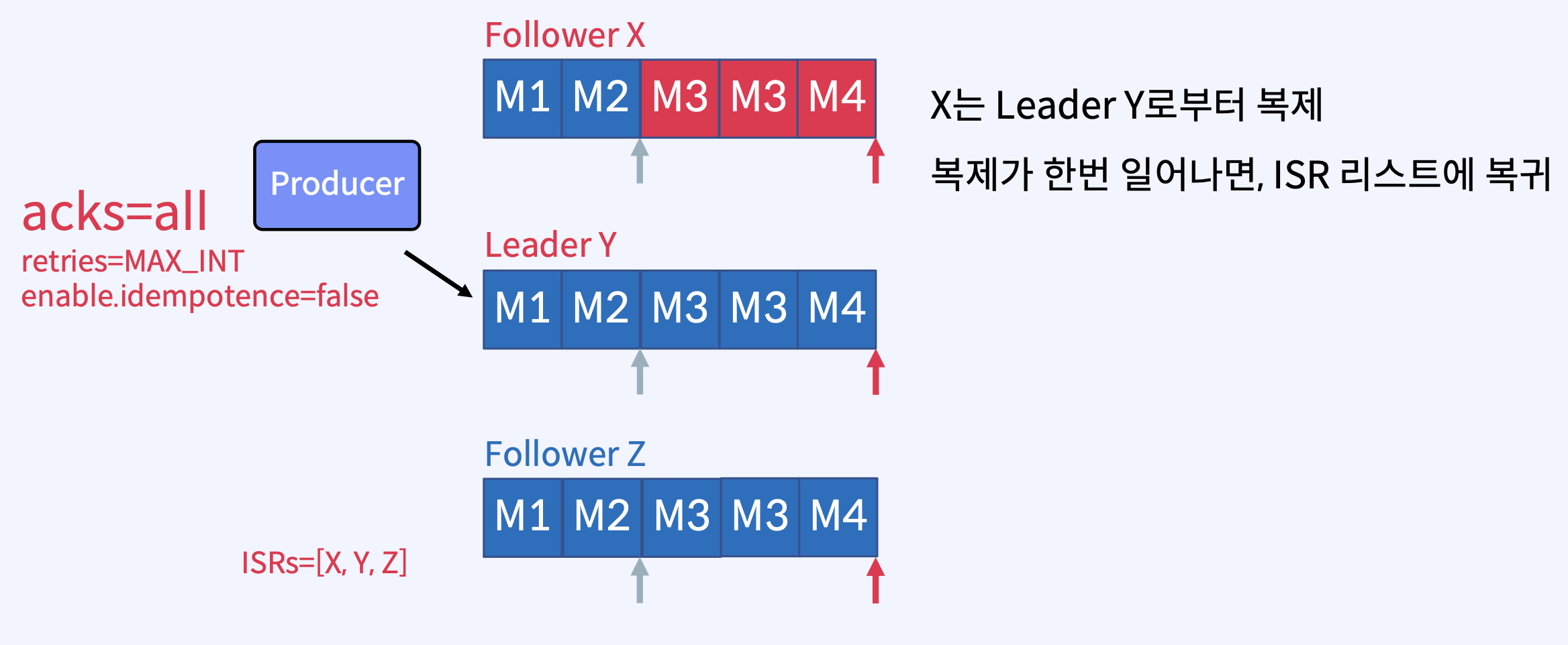 - Broker가 ack를 보내기 직전에 실패했지만 메시지가 Kafka Topic에 성공적으로 기록된 후에 이 재시도를 수행하면 메시지가 두 번 기록되어 최종 Consumer에게 두 번 이상 전달되어 중복 작업과 같은 잘못된 결과로 이어질 수 있다.