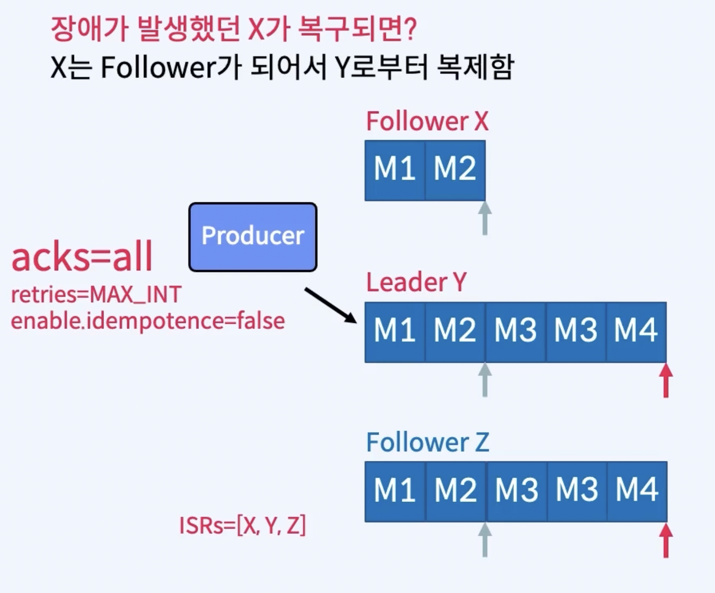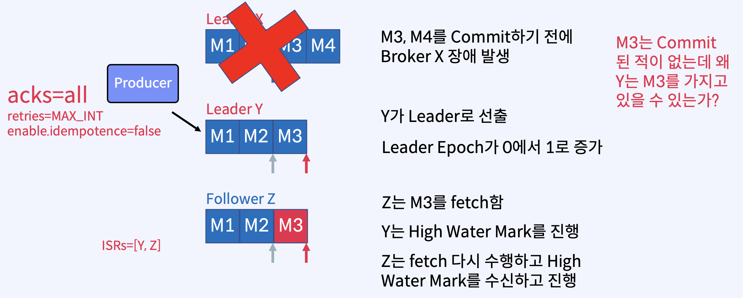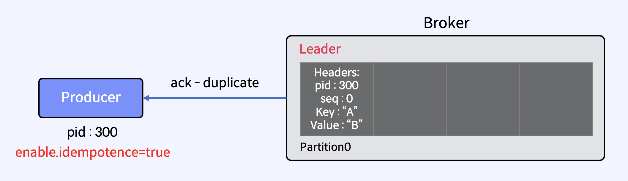 - Broker가 ack를 보내기 직전에 실패했지만 메시지가 Kafka Topic에 성공적으로 기록된 후에 이 재시도를 수행하면 메시지가 두 번 기록되어 최종 Consumer에게 두 번 이상 전달되어 중복 작업과 같은 잘못된 결과로 이어질 수 있다.