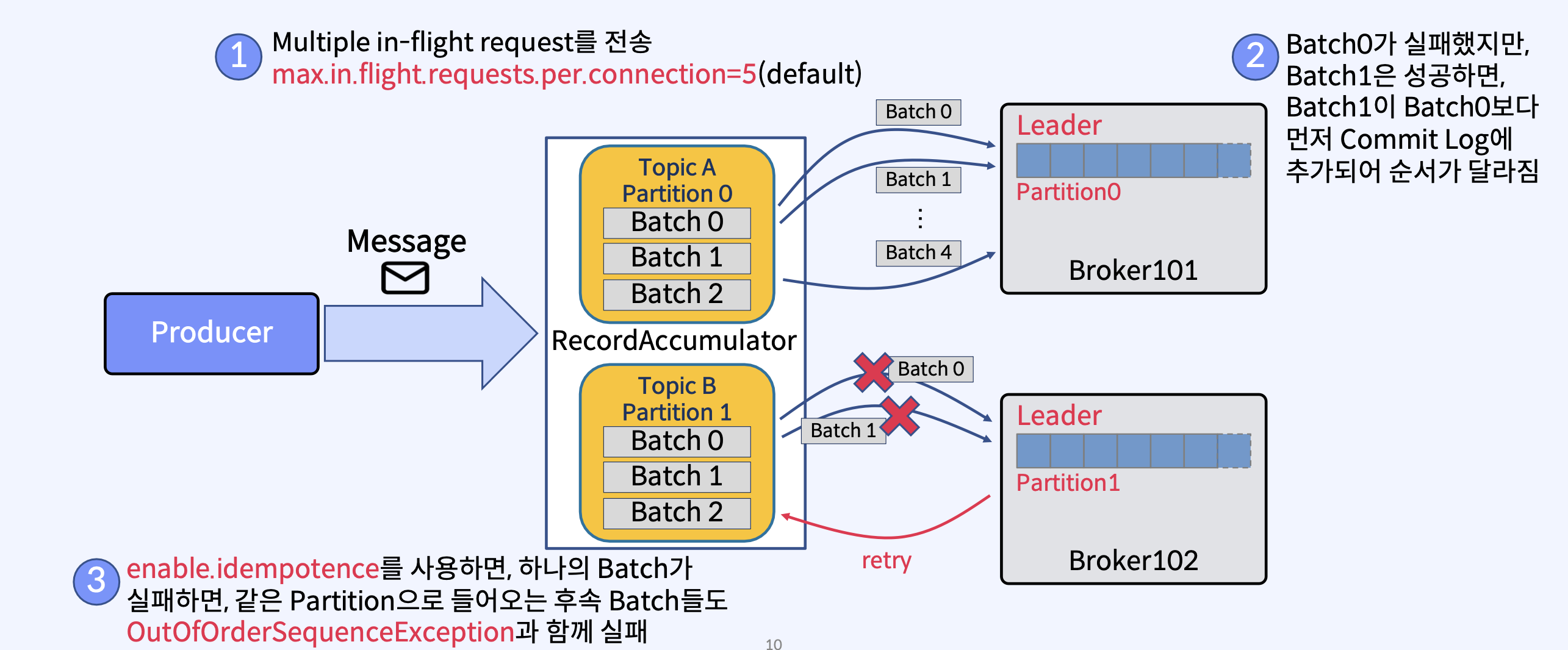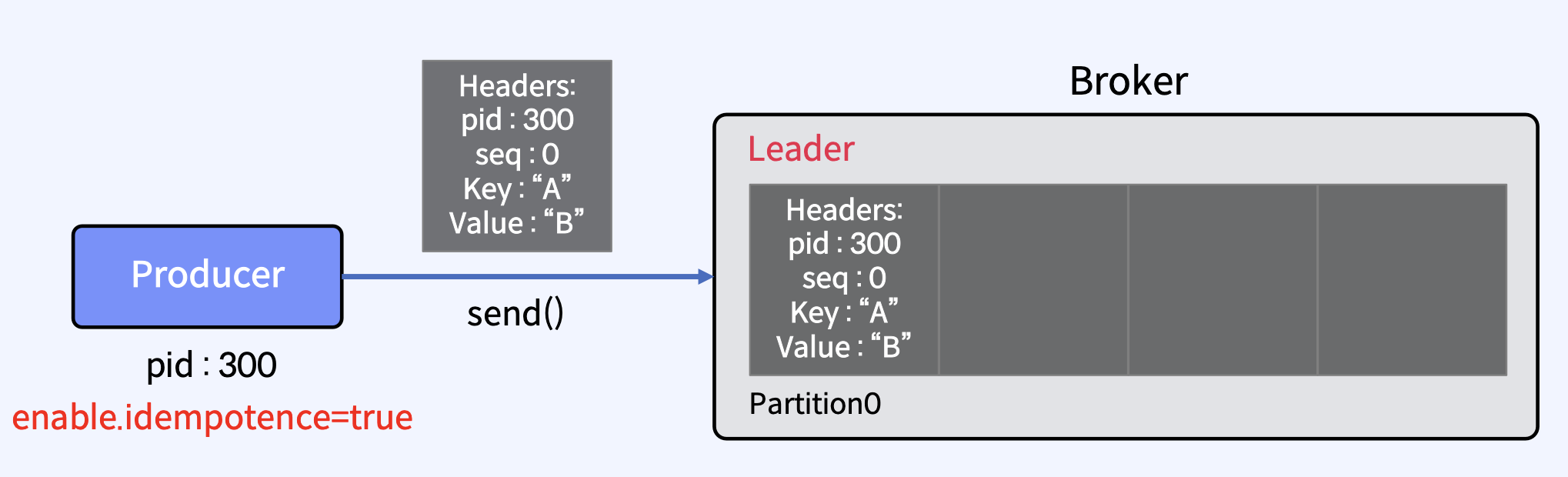 1. 각 Producer는 고유한 Producer ID를 사용하여 메시지 송신, 메시지는 Sequence Number와 고유한 Producer ID를 가지고 있다.