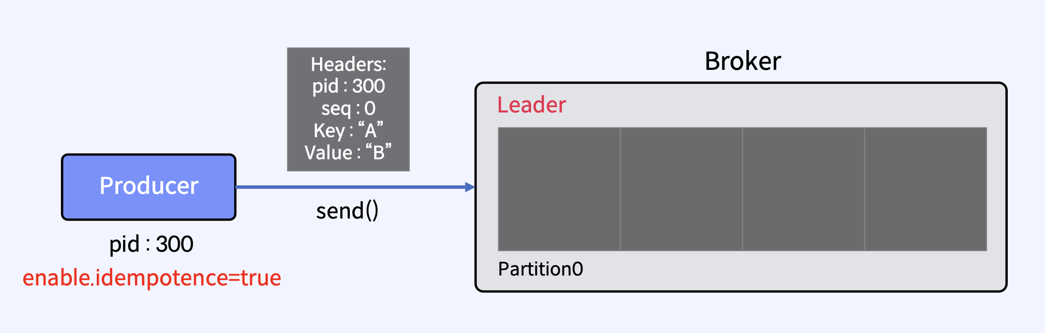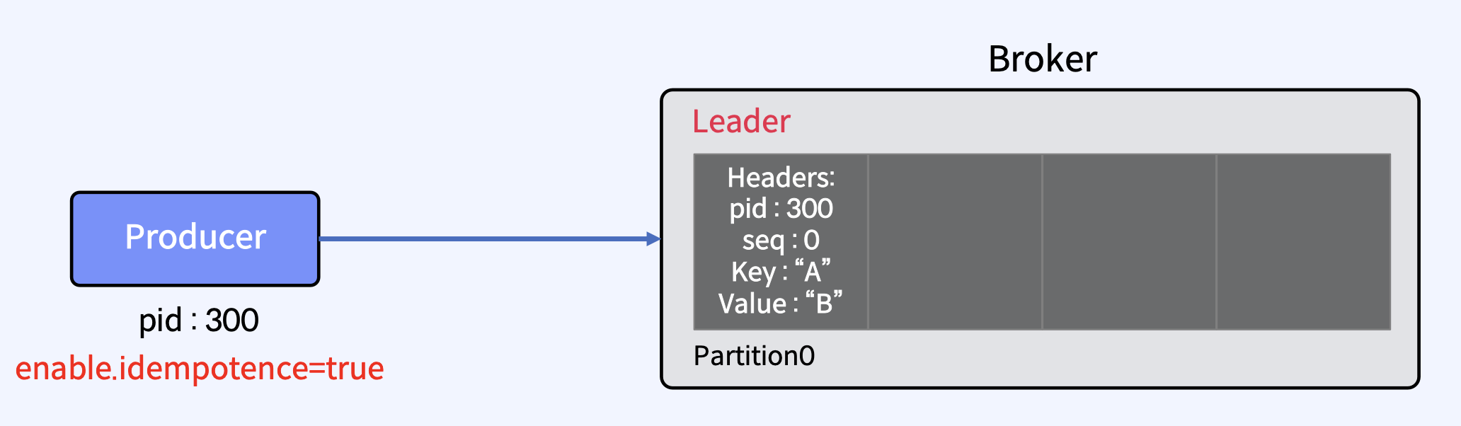 - Producer가 메시지 전송을 다시 시도하더라도, 메시지가 최종 Consumer에게 정확히 한 번 전달된다.