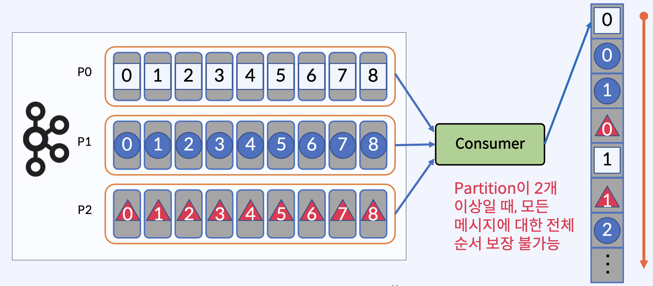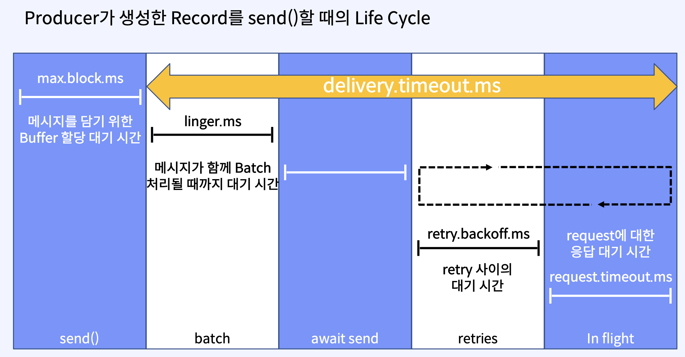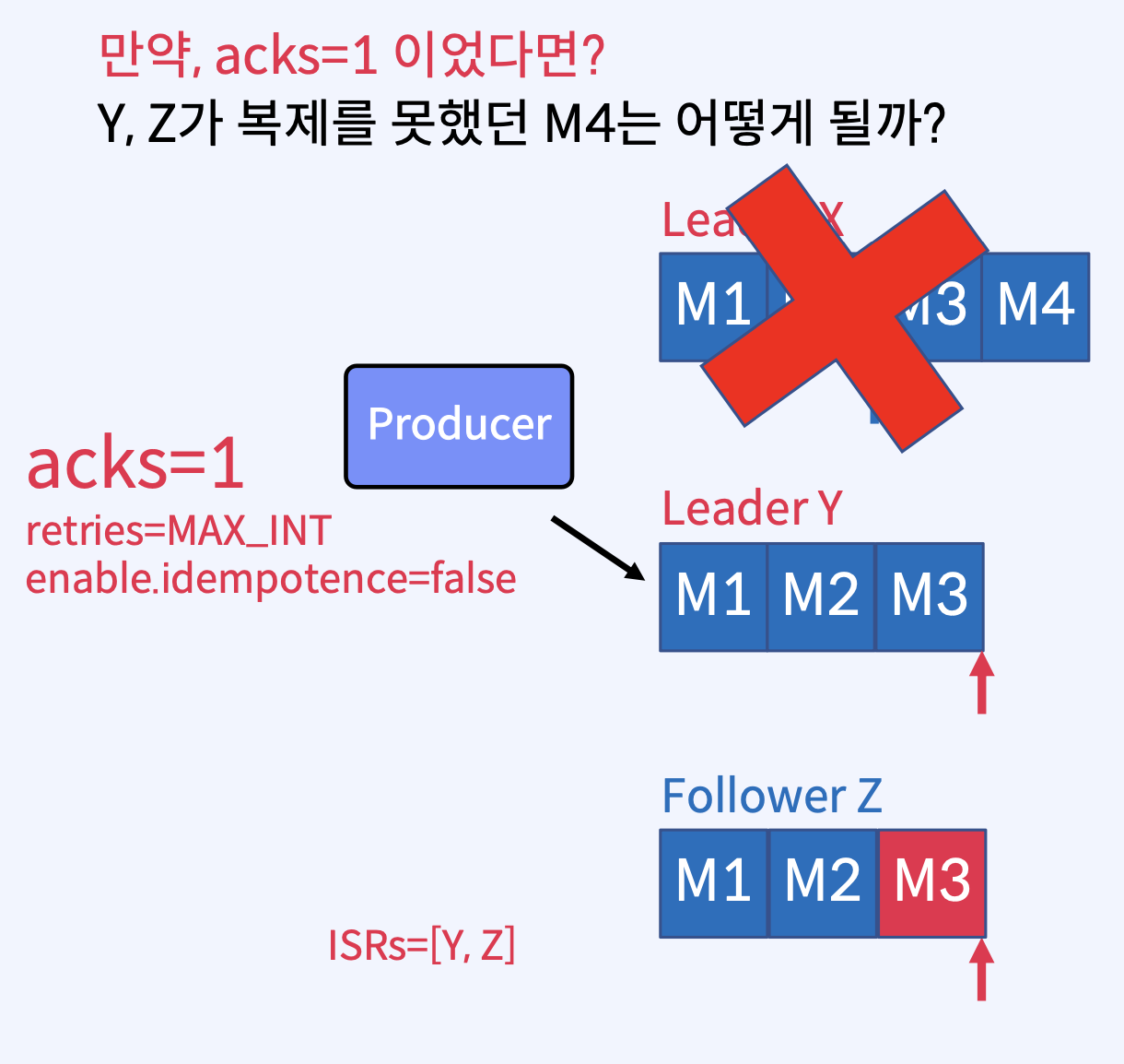 - 확인 시간이 초과되거나, 오류가 반환될 때 Producer가 재시도하지 않으면 메시지가 Kafka Topic에 기록되지 않아 Consumer에게 전달되지 않을 수 있다.