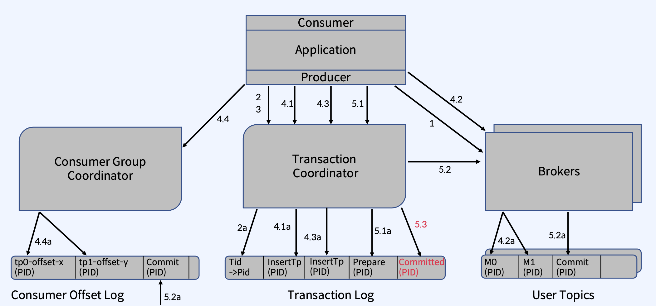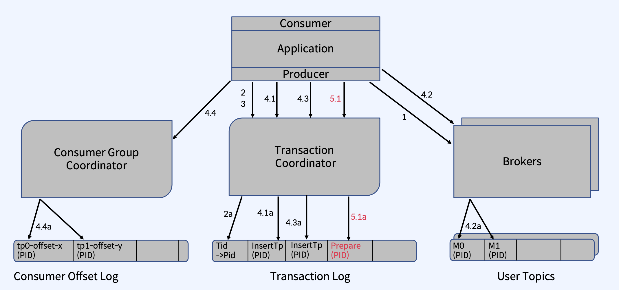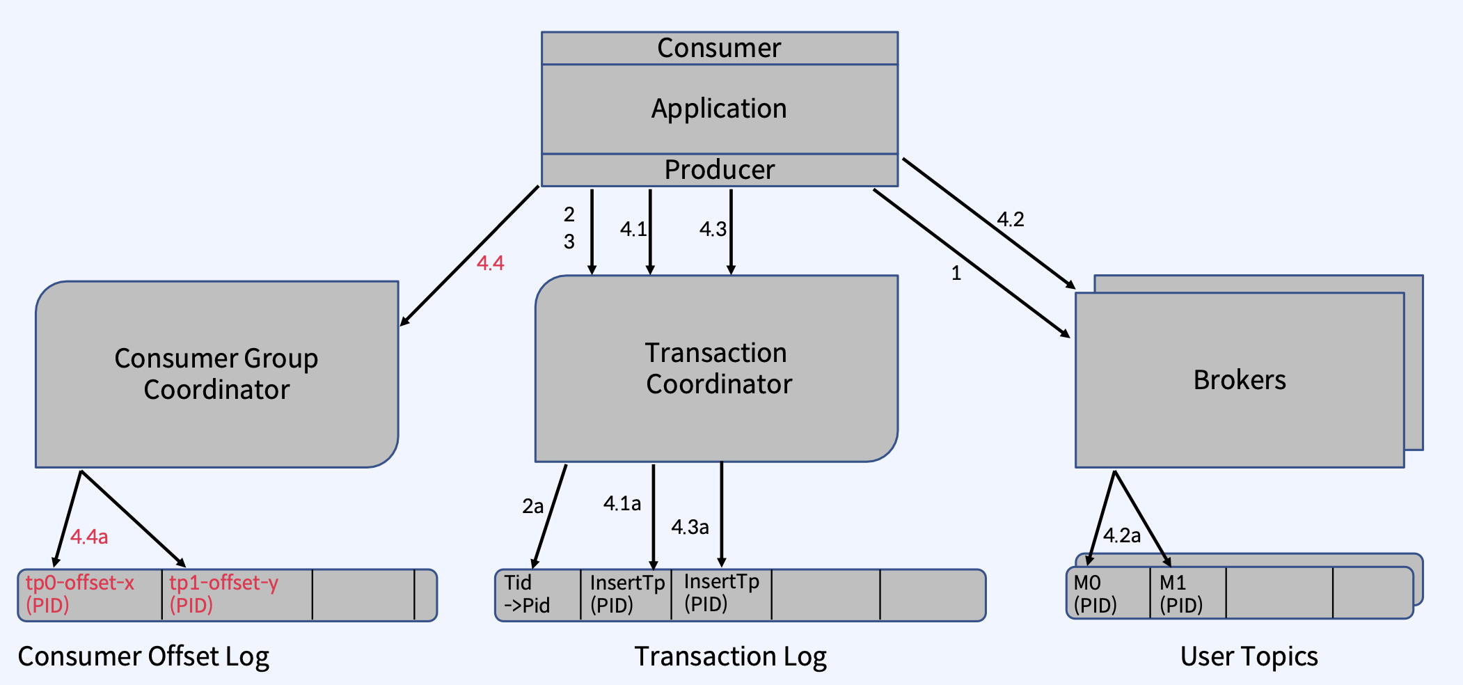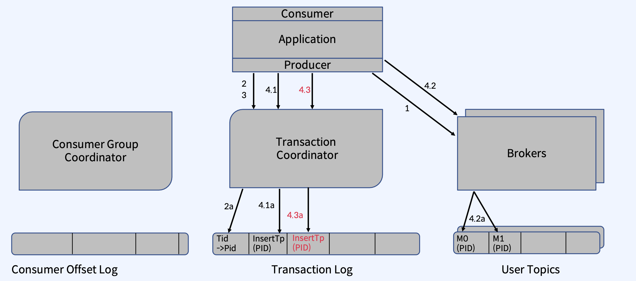 - Transaction Coordinator는 4.3a 단계에서 Transaction Log에 이 Topic Partition의 추가를 기록한다.