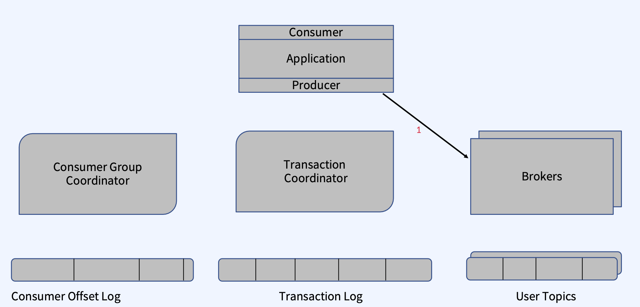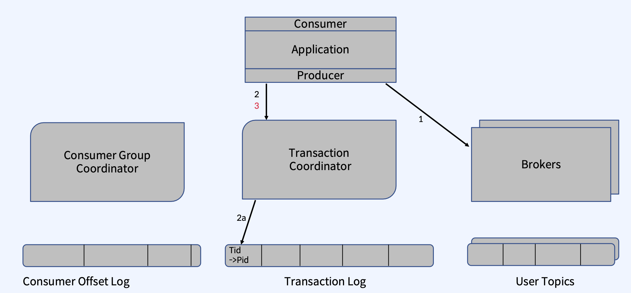 - Transaction Log: 새로운 Internal Kafka Topic으로써, Consumer Offset Topic과 유사하게 모든 Transaction의 영구적이고 복제된 Record를 저장하는 Transaction Coordinator의 상태 저장소