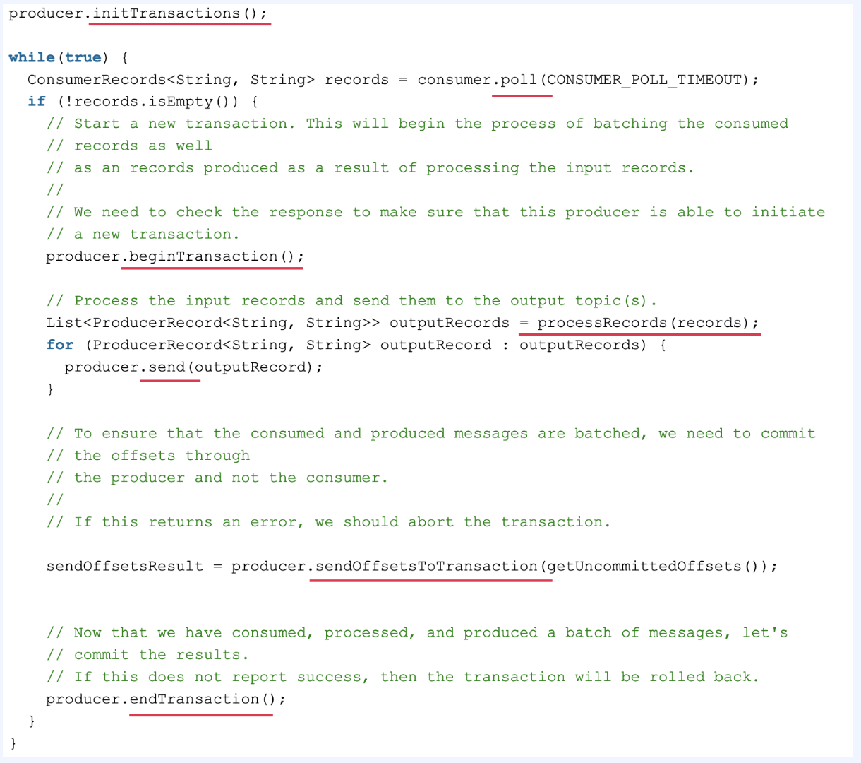 - Producer에는 Consume되거나 Produce되는 메시지를 Batch 처리할 수 있는 sendOffsetsToTransaction()이 있다.