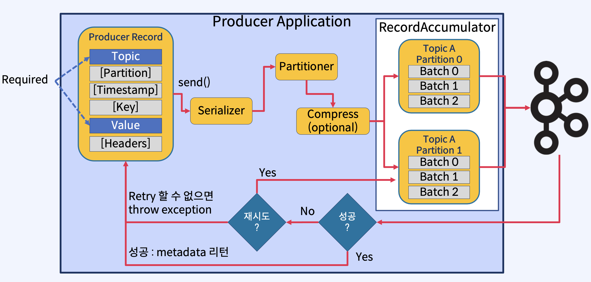 - 그러나, ack가 시간 초과되거나 오류를 수신하면 메시지가 Kafka Topic에 기록되지 않았다고 판단하고 메시지 전송을 다시 시도할 수 있다.