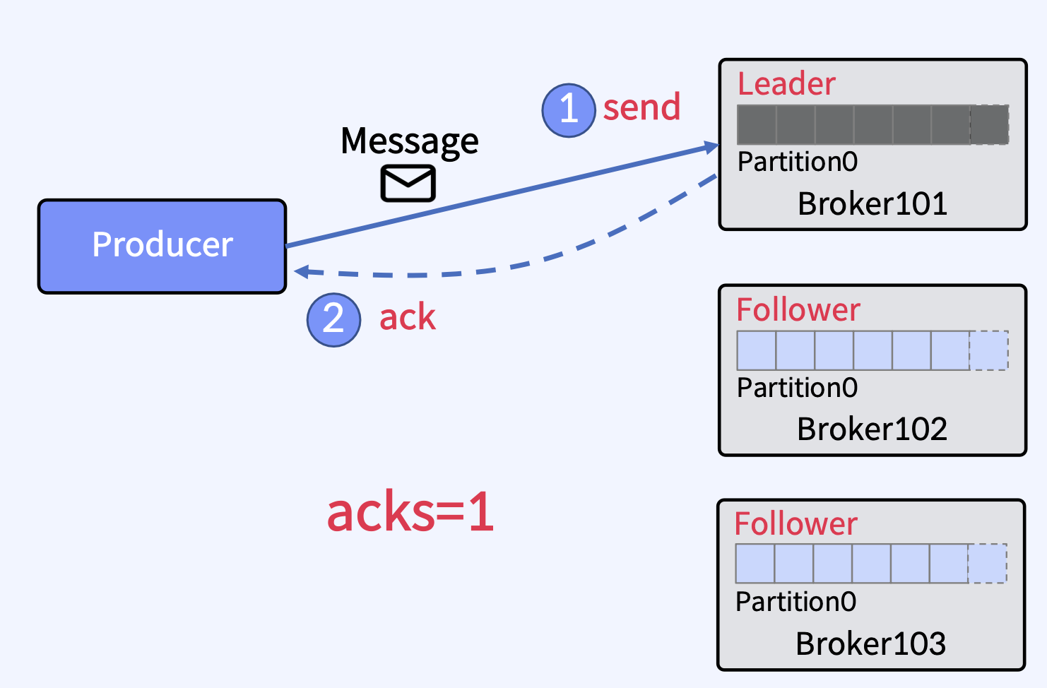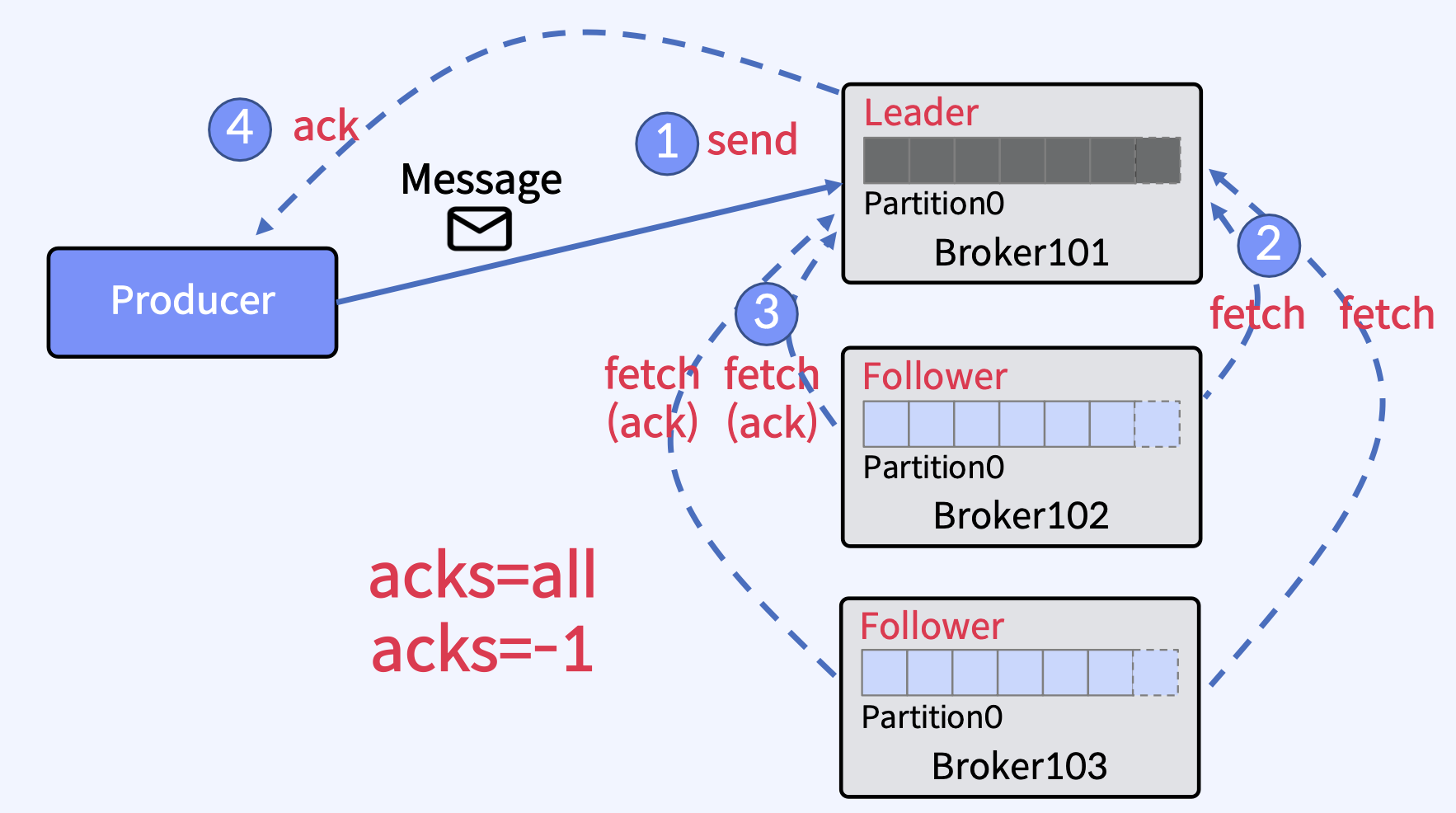 - Producer가 Kafka Broker로부터 ack를 수신하고 acks=all이면 메시지가 Kafka Topic에 최소 한 번 작성되었음을 의미한다.
