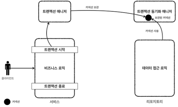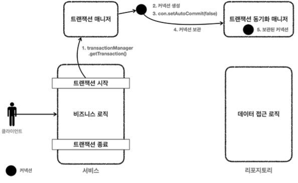 - 레포지토리 메서드들은 트랜잭션이 시작된 커넥션이 필요하다. 레포지토리는 DataSourceUtils.getConnection()을 사용해서 트랜잭션 동기화 매니저에 보관된 커넥션을 꺼내서 사용한다. 이 과정을 통해서 자연스럽게 같은 커넥션을 사용하고, 트랜잭션도 유지된다.