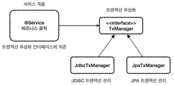 - 트랜잭션 추상화 덕분에 서비스 코드는 이제 JDBC 기술에 의존하지 않고, PlatformTransactionManager에 의존한다. 따라서, 향후 JDBC에서 JPA로 기술을 변경해도 DataSourceTransactionManager에서 JpaTransactionManager로 구현체만 갈아끼워주면 서비스 코드에는 아무런 변경도 할 필요가 없다.