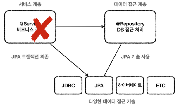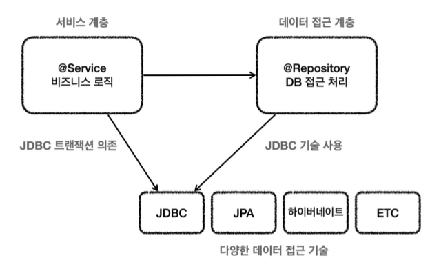 - 그런데 문제는 트랜잭션을 사용하기 위해서 javax.sql.DataSource, java.sql.Connection, java.sql.SQLException 같은 JDBC 기술에 의존해야 한다는 점이다.