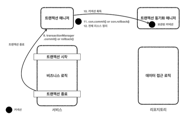 - 트랜잭션을 종료하려면 동기화된 커넥션이 필요하다. 트랜잭션 동기화 매니저를 통해 동기화된 커넥션을 획득한다.