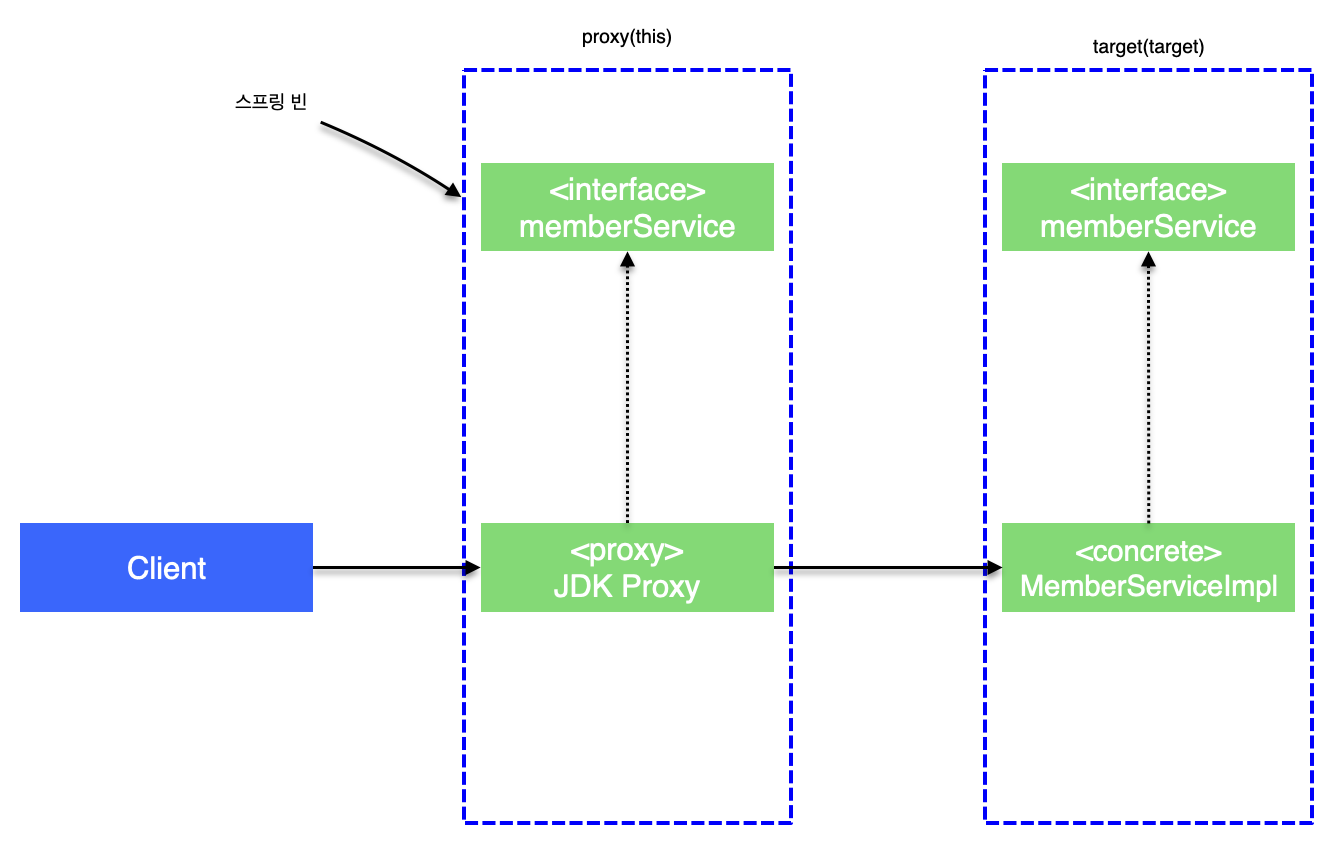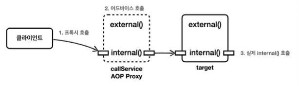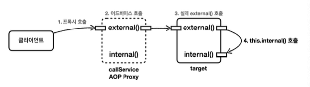 자바 언어에서 메서드 앞에 별도의 참조가 없으면 this 라는 뜻으로 자기 자신의 인스턴스를 가리킨다. 결과적으로 자기 자신의 내부 메서드를 호출하는 this.internal()이 되는데, 여기서 this는 실제 대상 객체(target)의 인스턴스를 뜻한다. 결과적으로 이러한 내부 호출은 프록시를 거치지 않는다. 따라서 어드바이스도 적용할 수 없다. 아래 그림을 보면 좀 더 이해가 될 것이다.