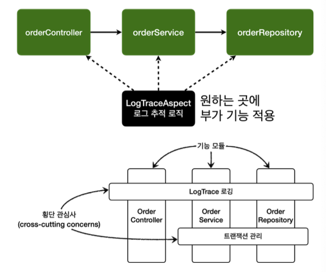 누군가는 이러한 부가 기능 도입의 문제점들을 해결하기 위해 오랜기간 고민해왔다. 그 결과 부가 기능을 핵심 기능에서 분리하고 한 곳에서 관리하도록 했다. 그리고 해당 부가 기능을 어디에 적용할지 선택하는 기능도 만들었다. 이렇게 부가 기능과 부가 기능을 어디에 적용할지 선택하는 기능을 합해서 하나의 모듈로 만들었는데 이것이 바로 애스팩트(aspect)이다. 애스팩트는 쉽게 이야기해서 부가 기능과 해당 부가 기능을 어디에 적용할지 정의한 것이다. 예를 들어서 "로그 출력 기능을 모든 컨트롤러에 적용해라" 라는 것이 정의되어 있다.