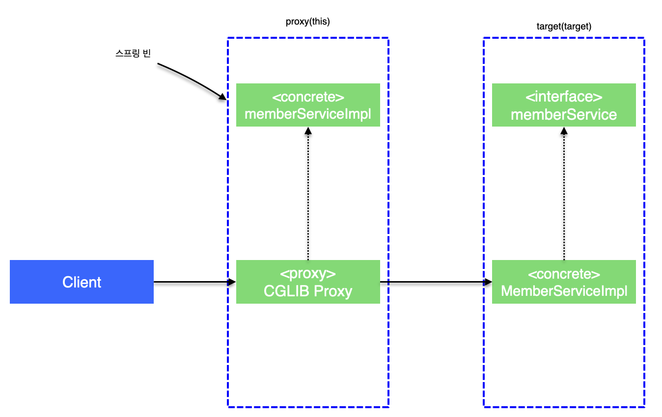 스프링은 프록시 방식의 AOP를 사용한다. 따라서 AOP를 적용하려면 항상 프록시를 통해서 대상 객체를 호출해야 한다. 이렇게 해야 프록시에서 어드바이스를 호출하고, 이후에 대상 객체를 호출한다. 만약, 프록시를 거치지 않고 대상 객체를 직접 호출하게 되면 AOP가 적용되지 않고, 어드바이스도 호출되지 않는다.