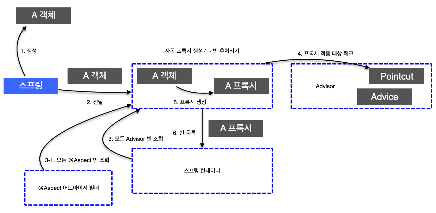 @Aspect를 사용해서 이전 작업과는 비교도 안되게 편리하게 프록시를 적용할 수 있다. @Aspect 애노테이션이 달린 클래스를 빈으로 등록하면 스프링이 자동으로 만들어주는 AnnotationAwareAspectJAutoProxyCreator 빈 후처리기를 통해 알아서 포인트컷의 조건을 기반으로 프록시를 만들어준다. 실무에서는 프록시를 적용하려고 하면 대부분 이 방식을 사용한다.