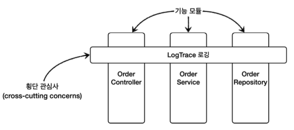 지금까지 우리가 진행한 애플리케이션 전반에 로그를 남기는 기능은 특정 기능 하나에 관심이 있는 기능이 아니다. 애플리케이션의 여러 기능들 사이에 걸쳐서 들어가는 공통 관심사이다. 이것을 바로 횡단 관심사(cross-cutting concerns)라고 한다. 우리가 지금까지 진행한 방법이 이렇게 여러곳에 걸쳐 있는 횡단 관심사의 문제를 해결하는 방법이었다.