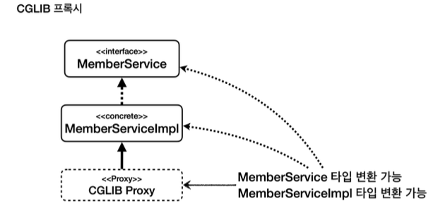 클래스 로딩 시점: 실제 대상 코드에 애스팩트를 통한 부가 기능 호출 코드가 포함된다. AspectJ를 직접 사용해야 한다.