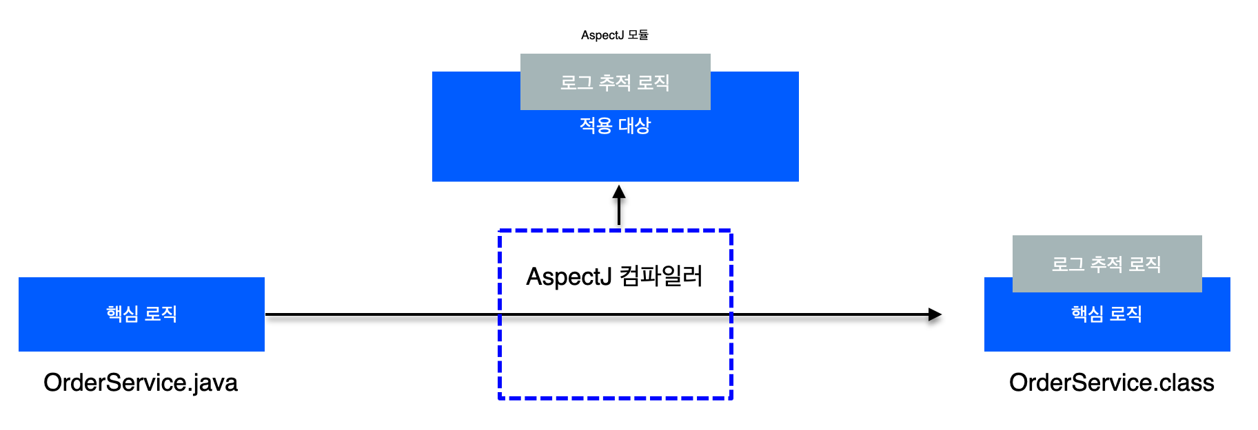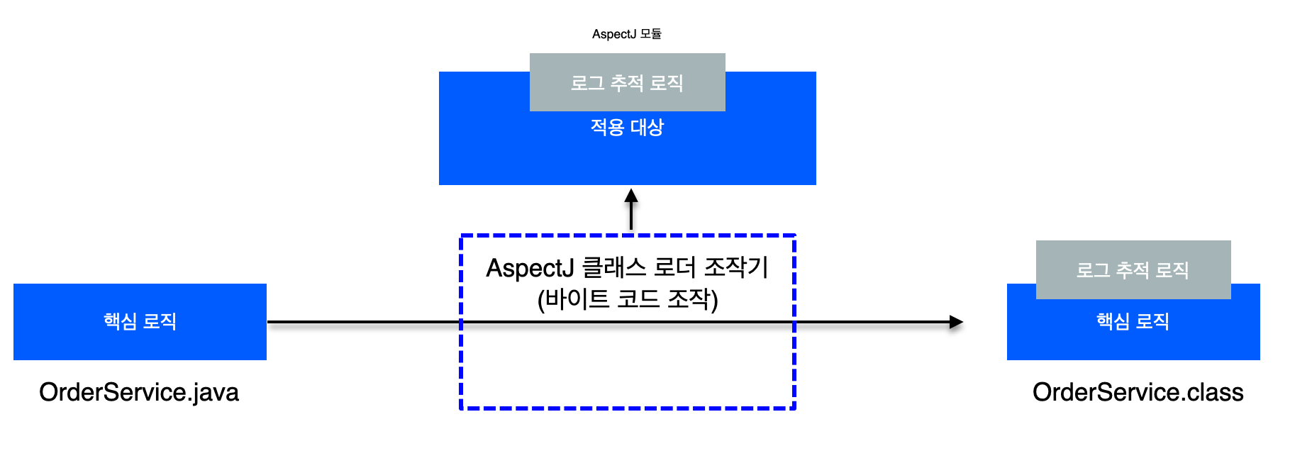 .java 소스 코드를 컴파일러를 사용해서 .class를 만드는 시점에 부가 기능 로직을 추가할 수 있다. 이때는 AspectJ가 제공하는 특별한 컴파일러를 통해 이루어진다. .class를 디컴파일 해보면 에스팩트 관련 호출 코드가 들어간다. 쉽게 말해서 부가 기능 코드가 핵심 기능이 있는 컴파일된 코드 주변에 실제로 붙어 버린다고 생각하면 된다. AspectJ 컴파일러는 Aspect를 확인해서 해당 클래스가 적용 대상인지 먼저 확인한 후 적용 대상인 경우에 부가 기능 로직을 적용한다. 이렇게 원본 로직에 부가 기능 로직이 추가되는 것을 위빙(Weaving)이라고 한다. 이 방법의 단점은 특별한 컴파일러가 필요하다는 것 그 자체이고 사용하기에 굉장히 복잡하다. 그래서 결론적으로 이 방법은 잘 사용하지 않는다.
