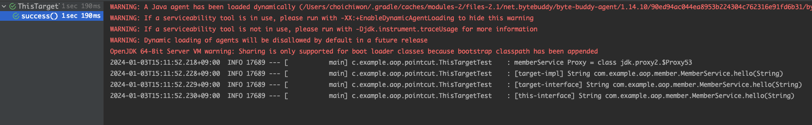 실행 결과를 보면, 이제는 internal()을 호출할 때 자기 자신의 인스턴스를 호출하는 것이 아니라 프록시 인스턴스를 통해서 호출하는 것을 확인할 수 있다. 당연히 AOP도 잘 적용된다.