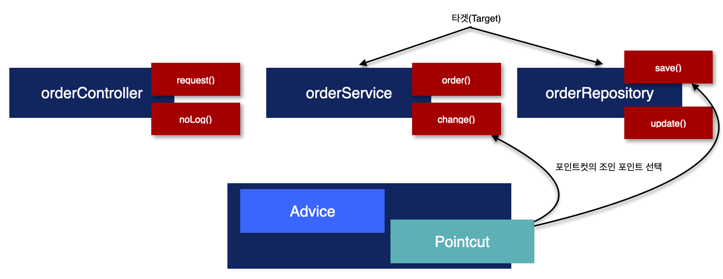 이렇게 AOP를 적용할 수 있는 지점을 조인 포인트(Join point)라 한다. AspectJ를 사용해서 컴파일 시점과 클래스 로딩 시점에 적용하는 AOP는 바이트코드를 실제 조작하기 때문에 해당 기능을 모든 지점에 다 적용할 수 있다. 그러나,프록시 방식을 사용하는 스프링 AOP는 메서드 실행 지점에만 AOP를 적용할 수 있다. 잘 생각해보자, 프록시는 실제 객체를 어떻게 호출할 수 있지? 메서드를 호출해서만 가능하다. 즉, 메서드 실행 지점에만 AOP를 적용할 수 밖에 없다. 프록시 방식을 사용하는 스프링 AOP는 스프링 컨테이너가 관리할 수 있는 스프링 빈에만 AOP를 적용할 수 있다. 스프링이 자동으로 등록해주는 빈 포스트 프로세서를 사용해야 하니까.