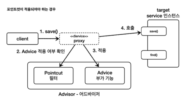 - 프록시의 어떤 메서드가 호출 되었을 때 어드바이스를 적용할 지 판단한다. (프록시 내부)