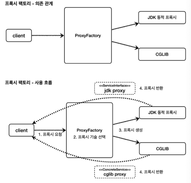 5. 프록시 생성: 프록시 적용 대상이면 프록시 팩토리를 사용해 프록시를 생성하고 반환해서 프록시를 스프링 빈으로 등록한다. 만약 프록시 적용 대상이 아니라면 원본 객체를 반환해서 원본 객체를 스프링 빈으로 등록한다.
