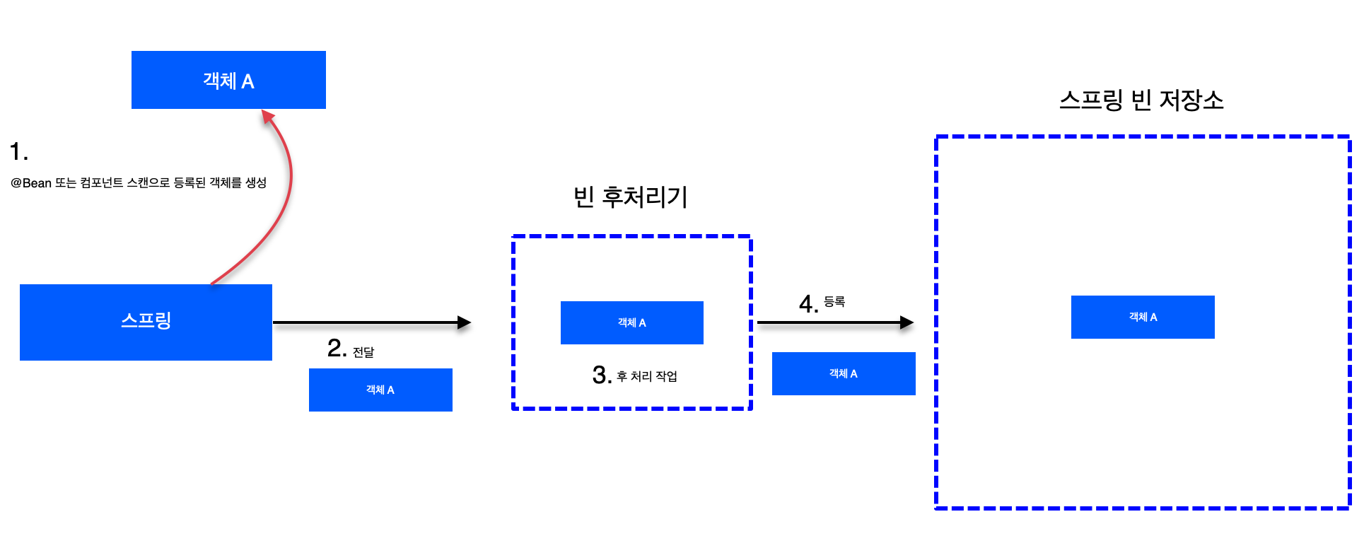 2. 전달: 생성된 객체를 빈 저장소에 등록하기 직전에 빈 후처리기에 전달한다.