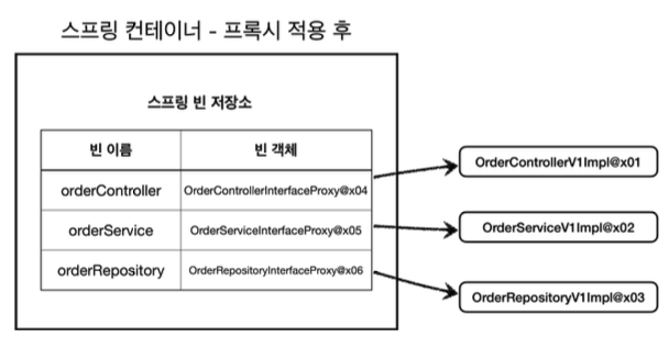 그리고 컴포넌트 스캔처럼 스프링이 직접 대상을 빈으로 등록하는 경우에도 중간에 빈 등록 과정을 가로채서 원본 대신에 프록시를 스프링 빈으로 등록할 수 있다. 덕분에 애플리케이션에 수많은 스프링 빈이 추가되어도 프록시와 관련된 코드는 전혀 변경하지 않아도 된다. 그리고 컴포넌트 스캔을 사용해도 프록시가 모두 적용된다.