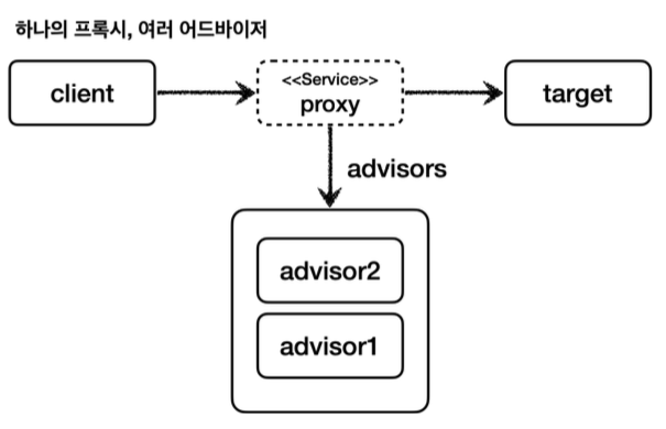 - advisor1, advisor2의 포인트컷을 모두 만족: 프록시 1개 생성, 프록시에 advisor1, advisor2 모두 포함