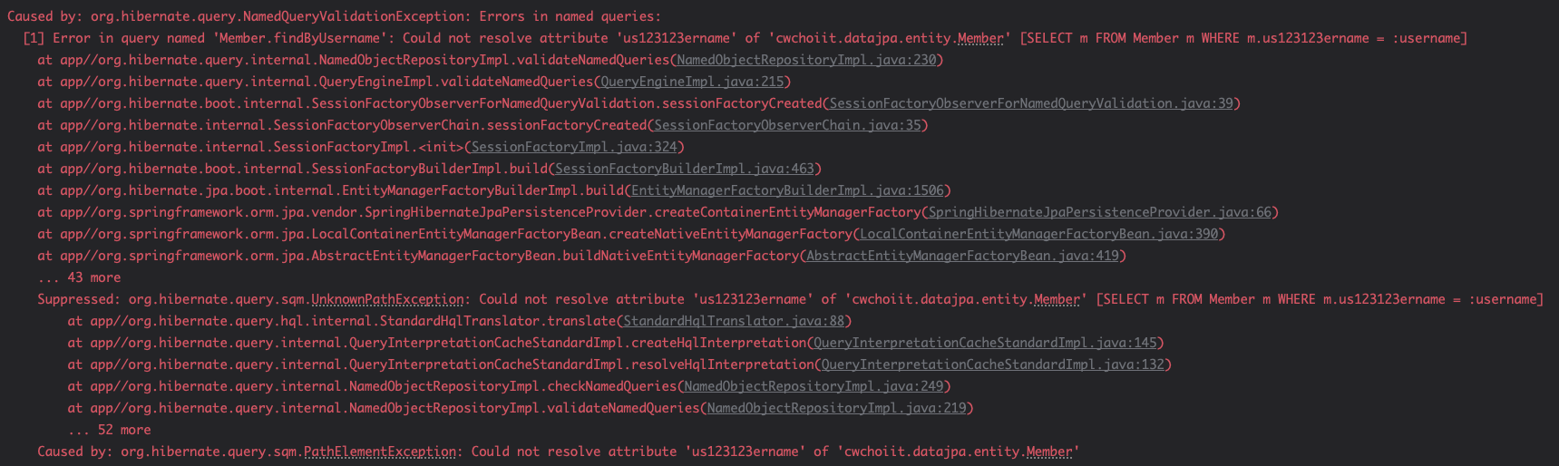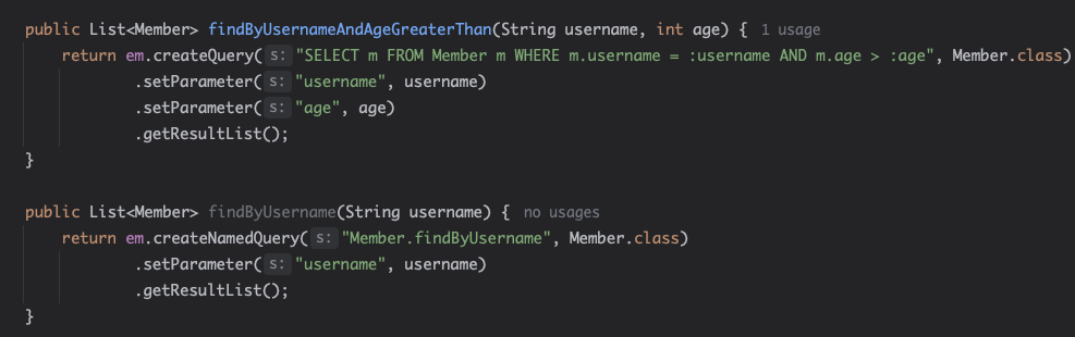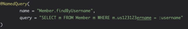 이 방법은 위의 문제를 해결해주지만 결론부터 말하면 이 기능은 거의 사용하지 않으니 그냥 이런게 NamedQuery구나? 하고 넘어가면 된다. 바로 아래 코드를 보자.